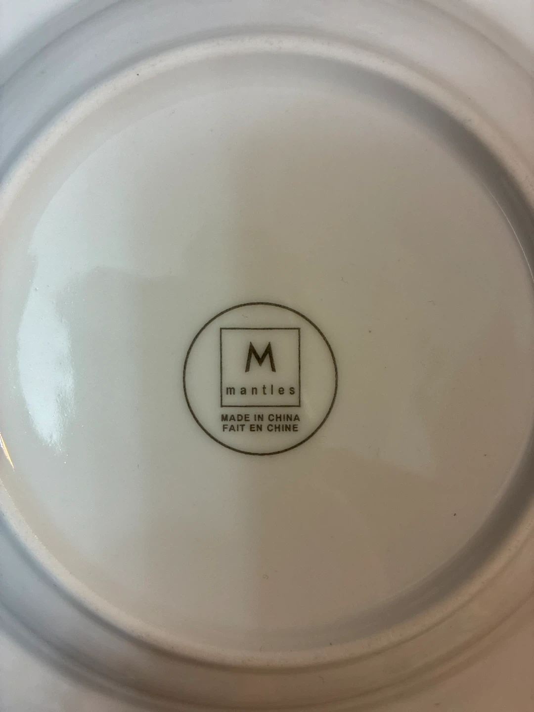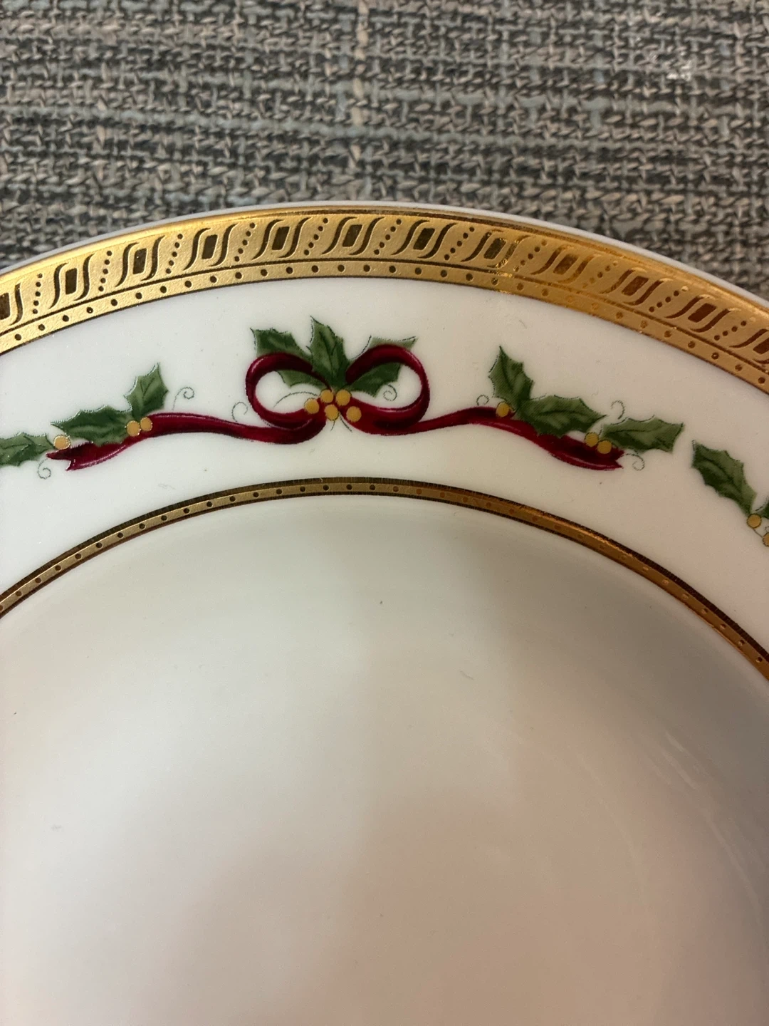 Set of four 8.5” Mantles soup bowls featuring a festive holly and ribbon design with gold trim. Porcelain material. Dishwasher safe for easy cleanup!