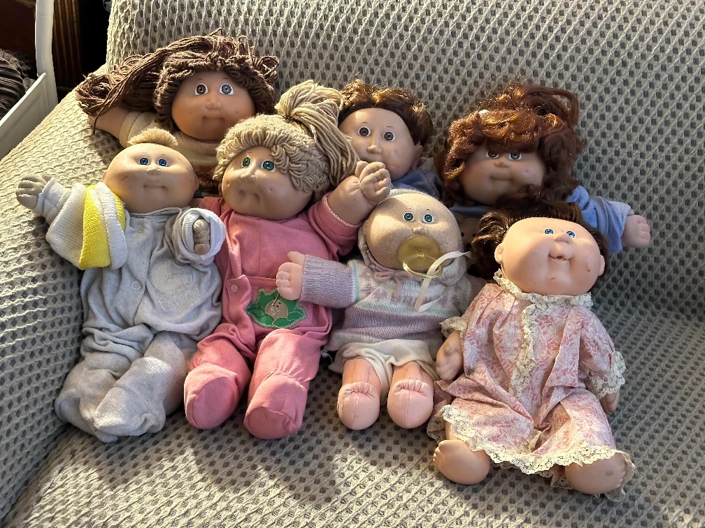 This set includes eight Cabbage Patch Kids dolls, each with unique outfits and hairstyles. They're soft-bodied with vinyl heads and feature the classic Cabbage Patch Kids look. These dolls are great for collectors or for playtime! Used but in good condition.