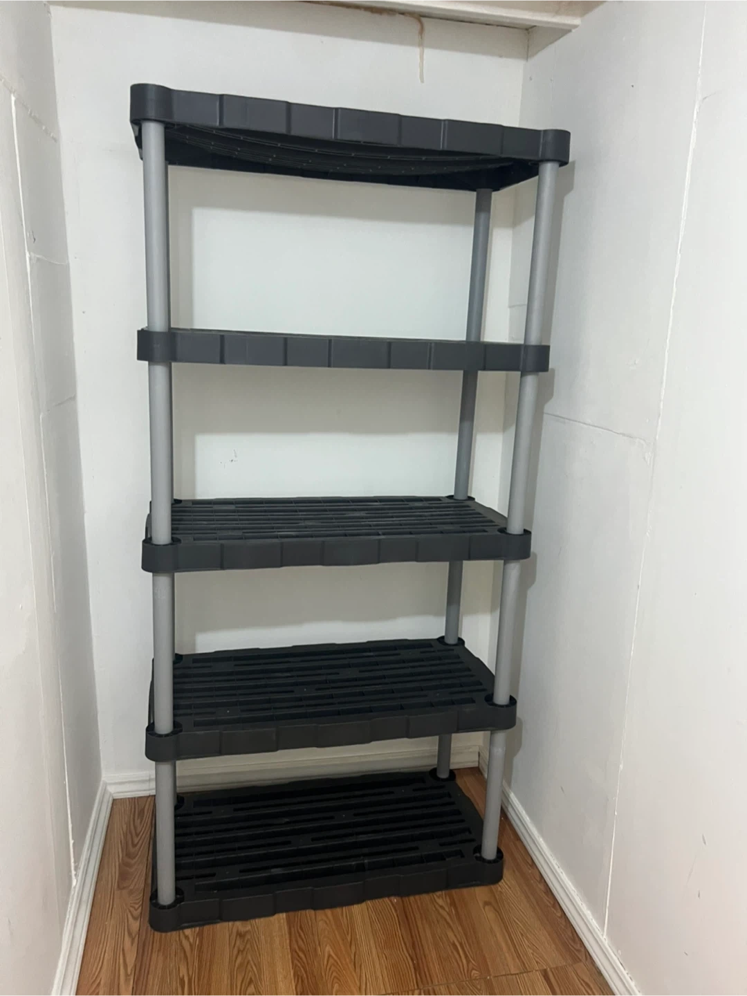 This is a 5-shelf plastic storage unit with a black finish and grey poles. It's made of durable plastic and is perfect for organizing garages, basements, or workshops. Assembly is simple and requires no tools!