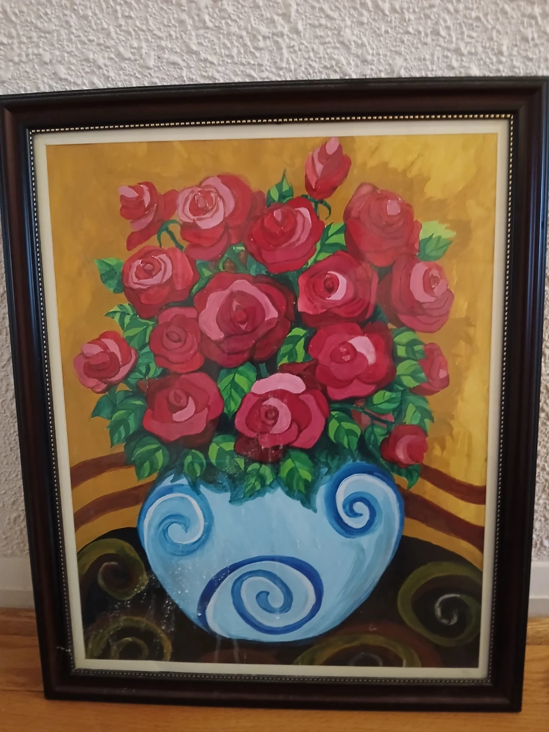 Framed painting depicting a bouquet of red roses in a light blue vase with decorative swirls. The background features yellow and brown stripes with dark green spiral accents at the bottom. It's framed with dark wood. Watercolor hand painting