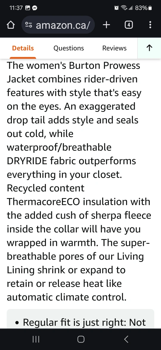 size xl bought on Amazon for 319.99 waited too long to return This women's ski jacket is black in colour and has a regular fit. The jacket is waterproof and breathable. It features a drop tail and a sherpa fleece inside the collar. It is made with Dryride 2-Layer Stretch Polyester fabric.