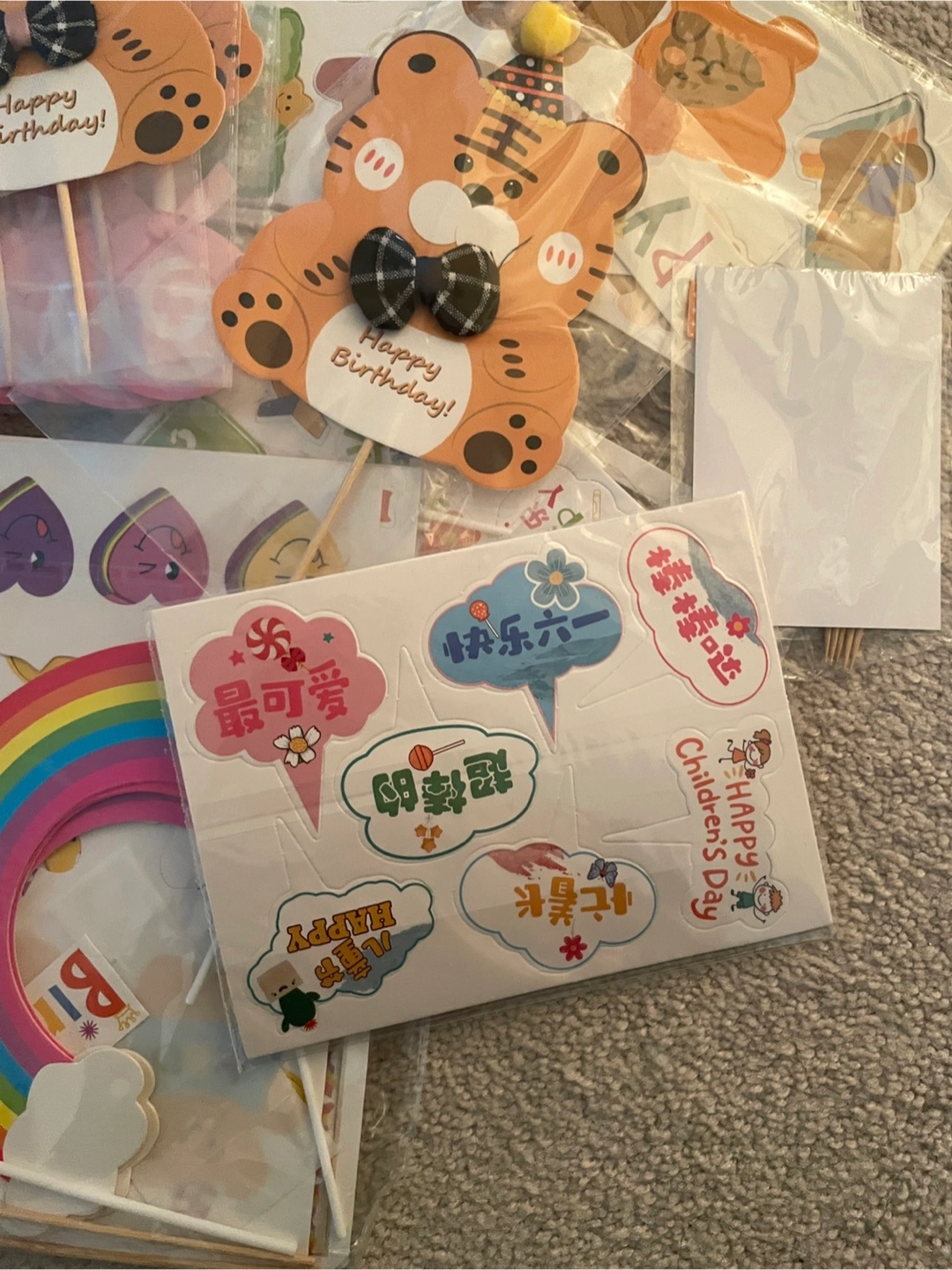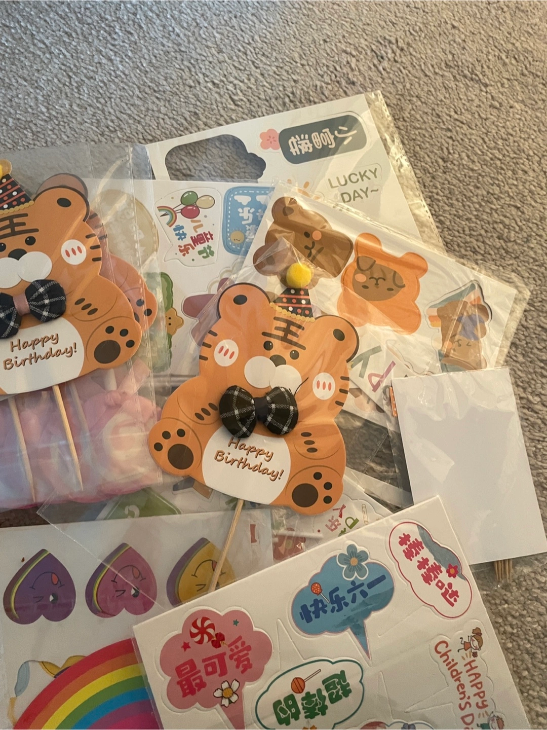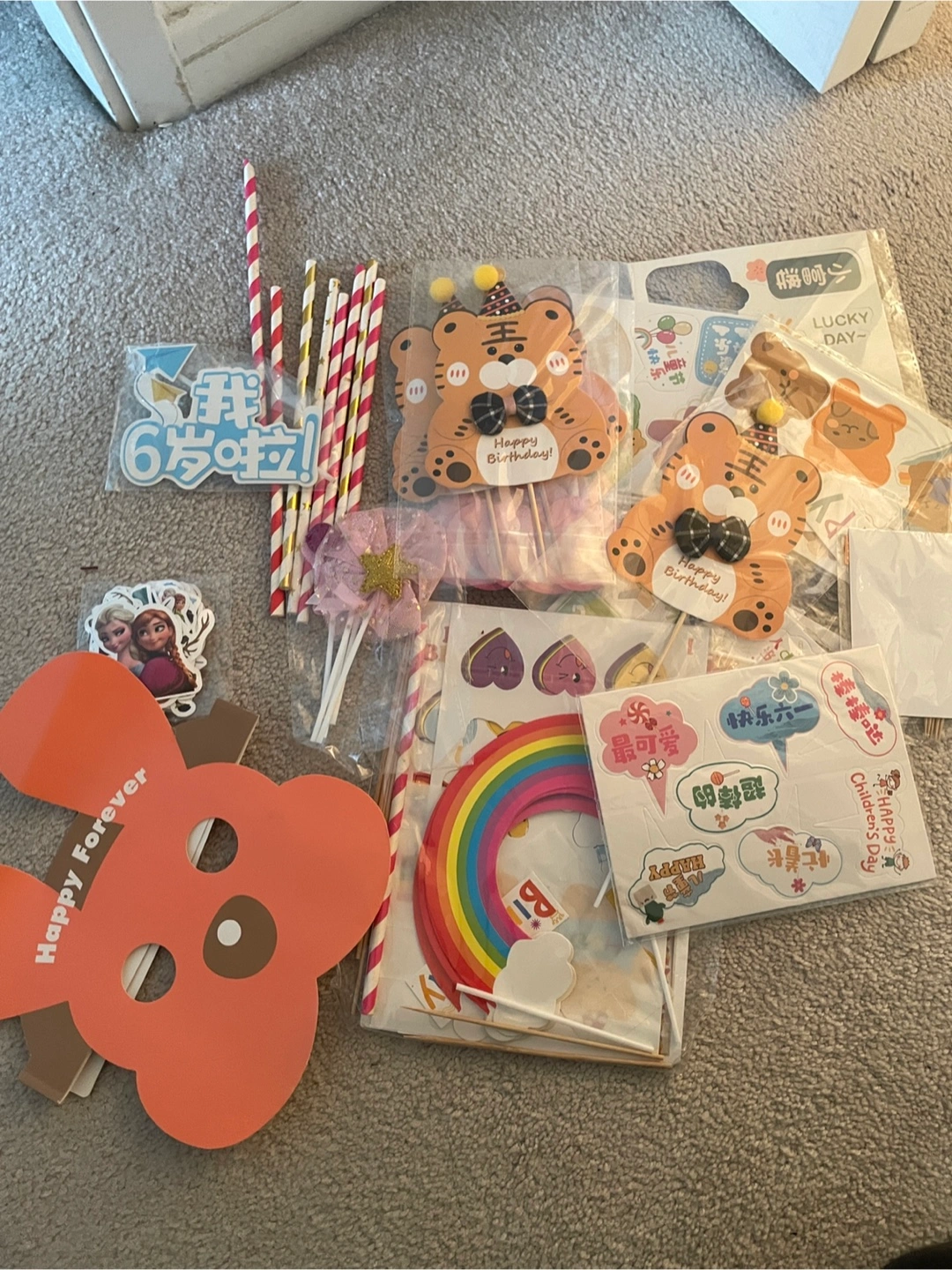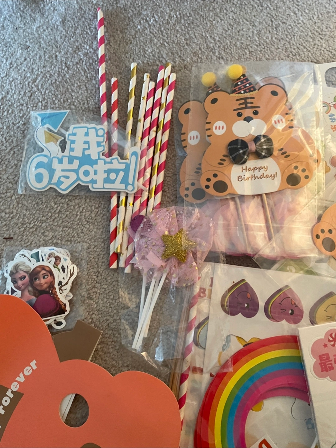 This set includes various birthday decorations like cake toppers, paper straws, and stickers. Features include a cute tiger design, rainbow accents, and Frozen-themed stickers. It's perfect for celebrating a child's birthday party!