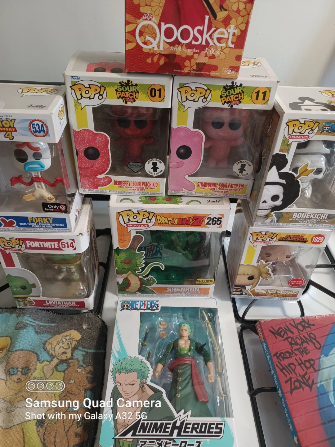 This lot includes a Funko Pop! Shenron from Dragon Ball Z and Roronoa Zoro from One Piece Anime Heroes. Also present are Funko Pop! figures for Redberry Sour Patch Kid and Strawberry Sour Patch Kid, along with other Funko Pop! figures. These collectibles are in their original packaging..different prices..
