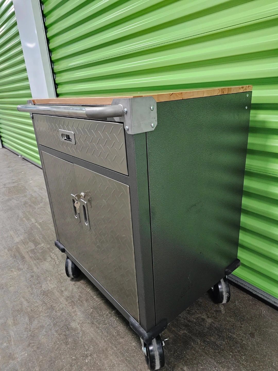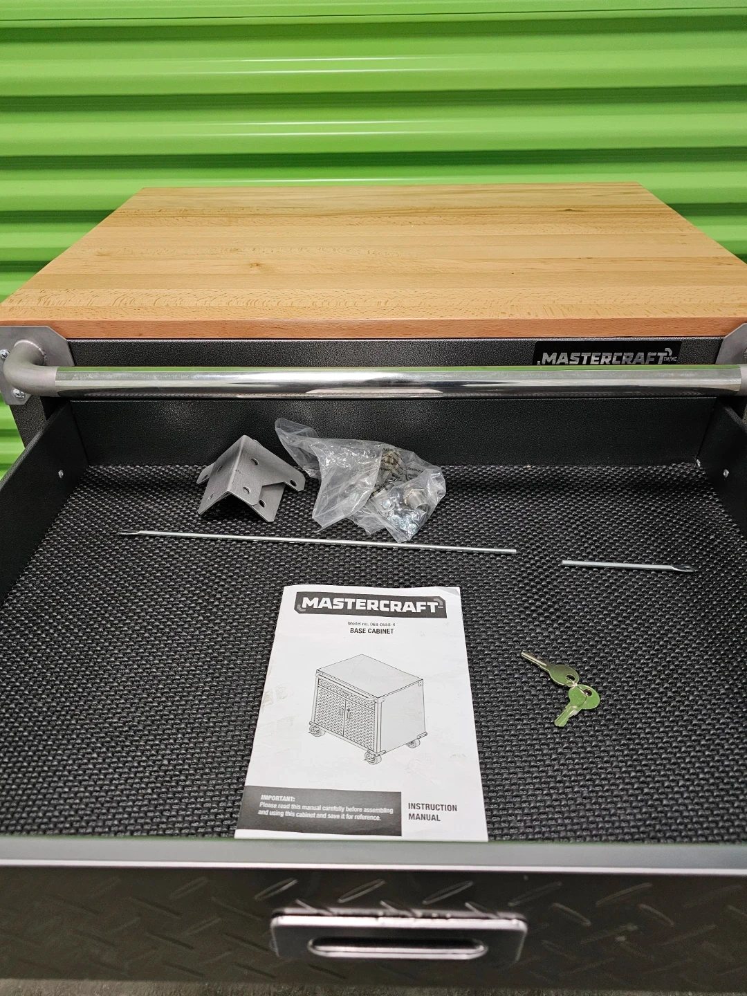 Mastercraft rolling tool chest with a butcher block top. It features one drawer and a two-door cabinet below. Includes keys and some hardware.