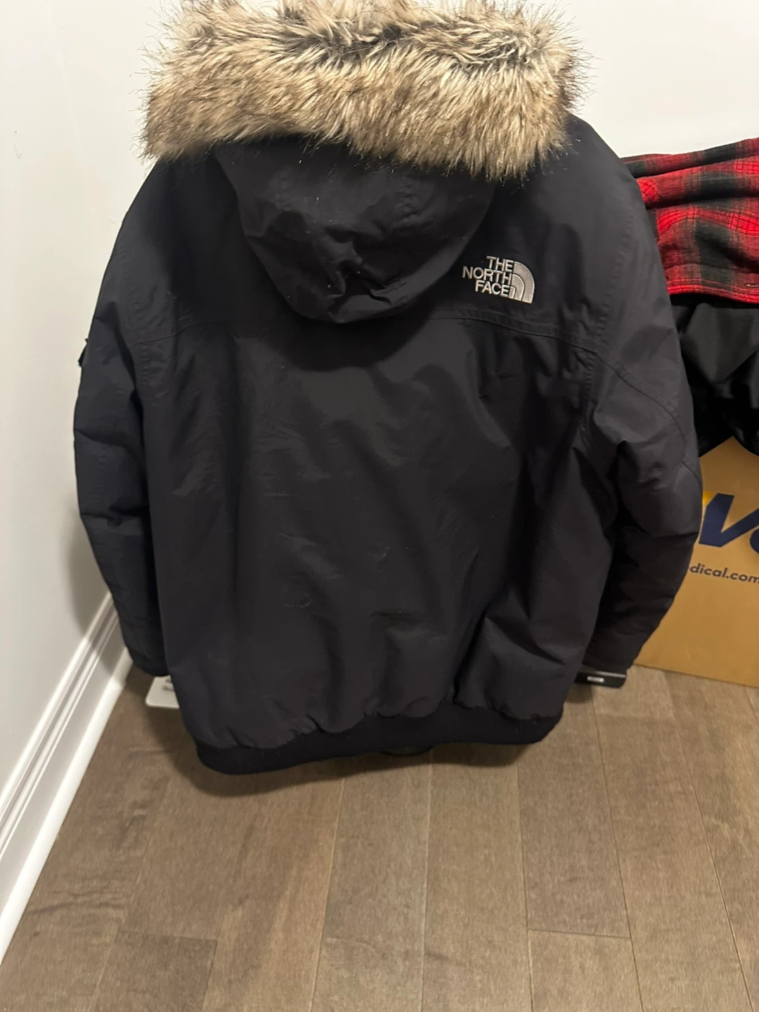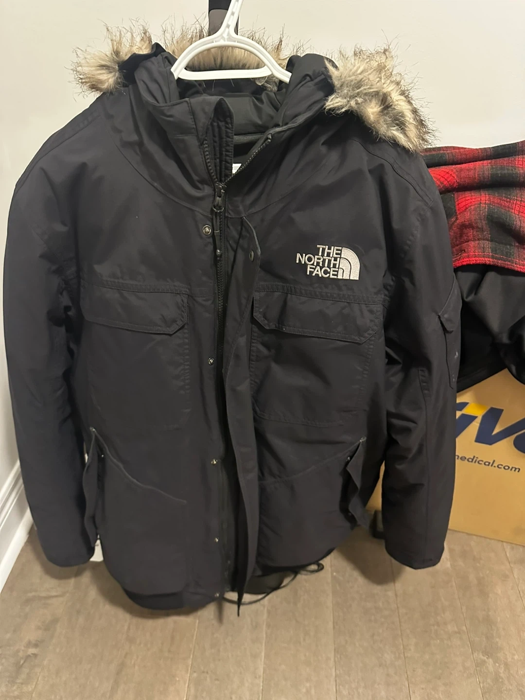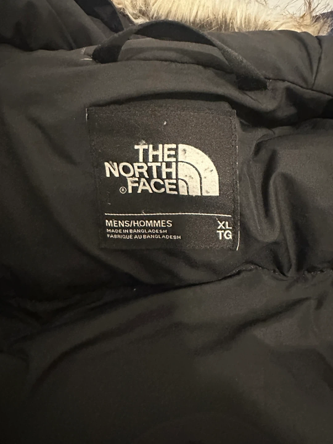This is a men's XL black winter parka from The North Face. It's made in Bangladesh and features a faux fur-lined hood. It's a warm jacket for colder weather. Brampton area