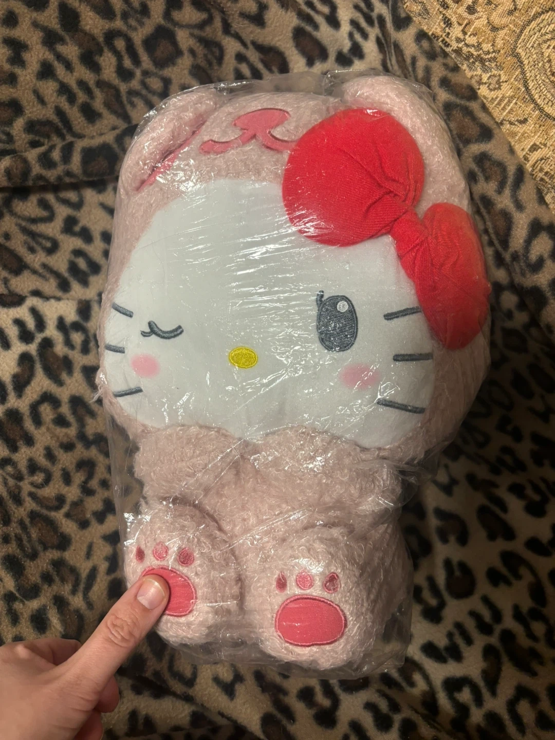 This is a pink Hello Kitty plush toy. It's soft and cuddly, perfect for fans of the character. It's still in its original plastic packaging. Open to offers