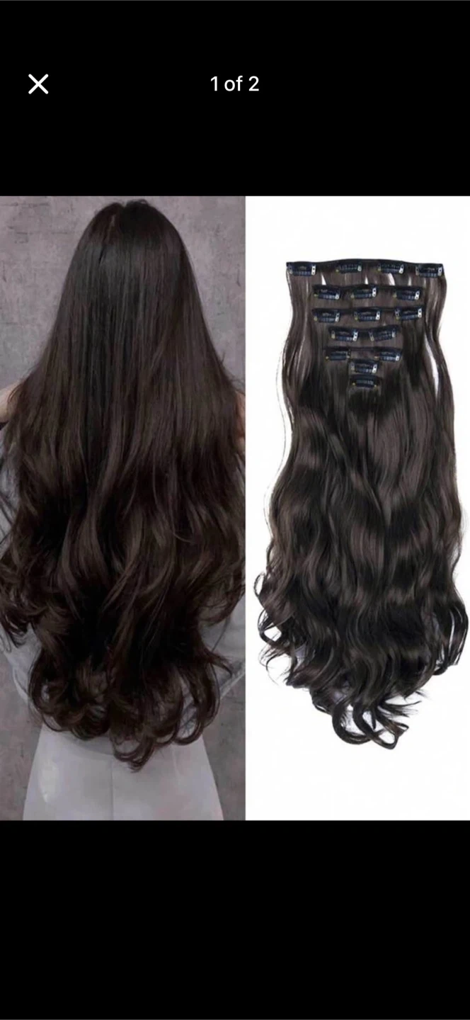 These clip-in hair extensions add instant length and volume. They feature a blend of brown and blonde highlights for a natural look. Synthetic material.