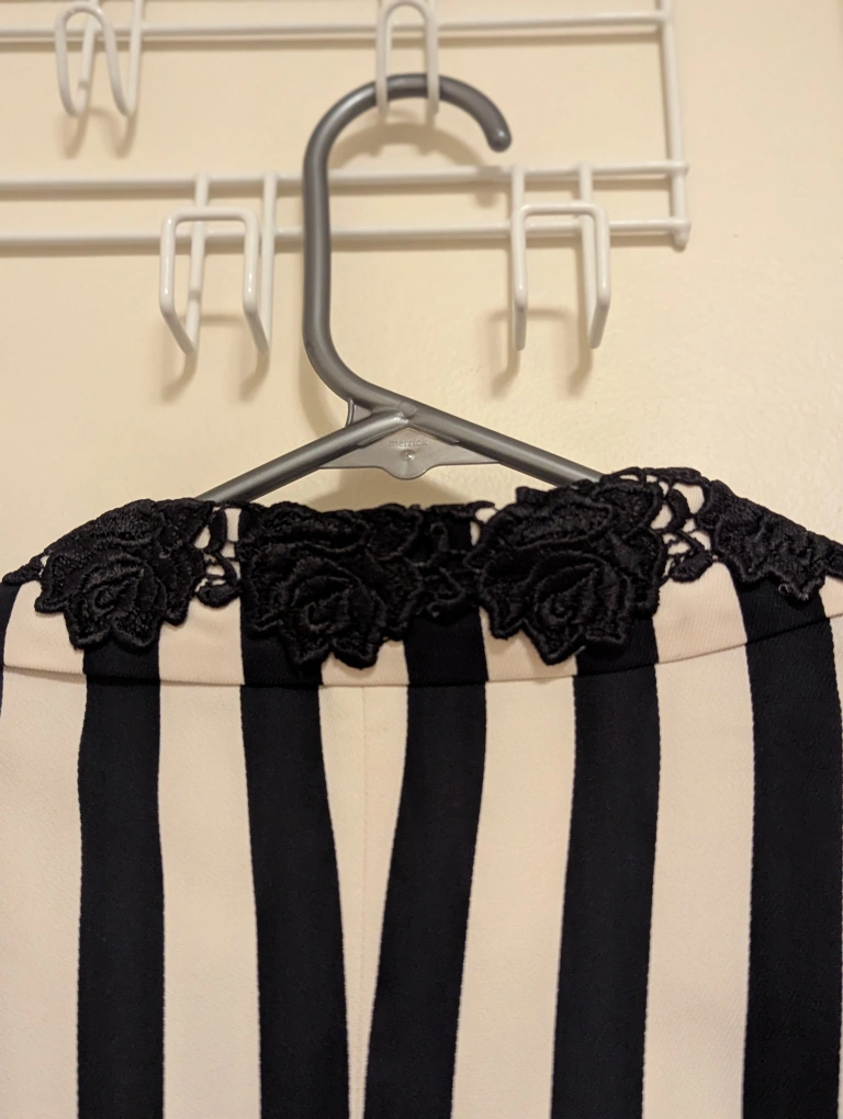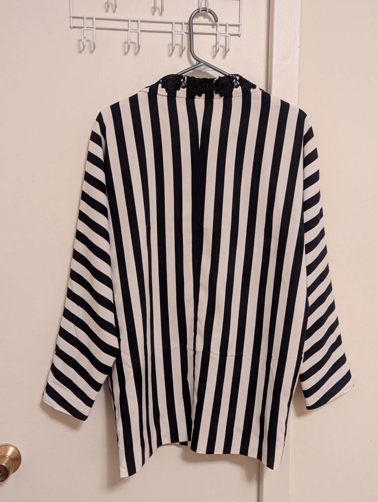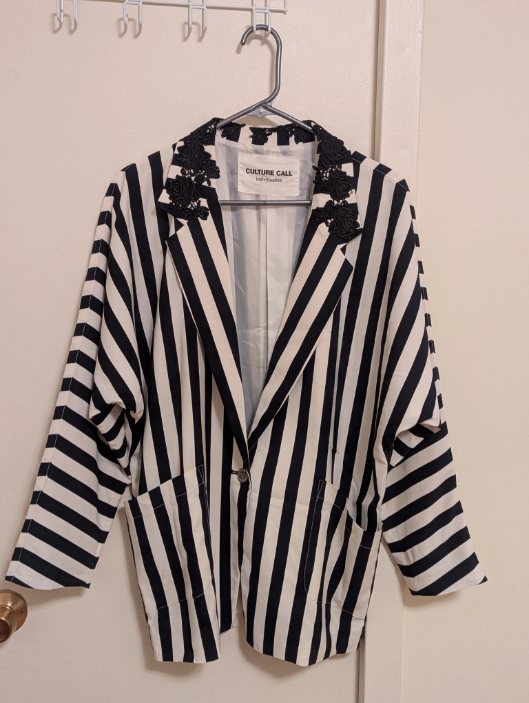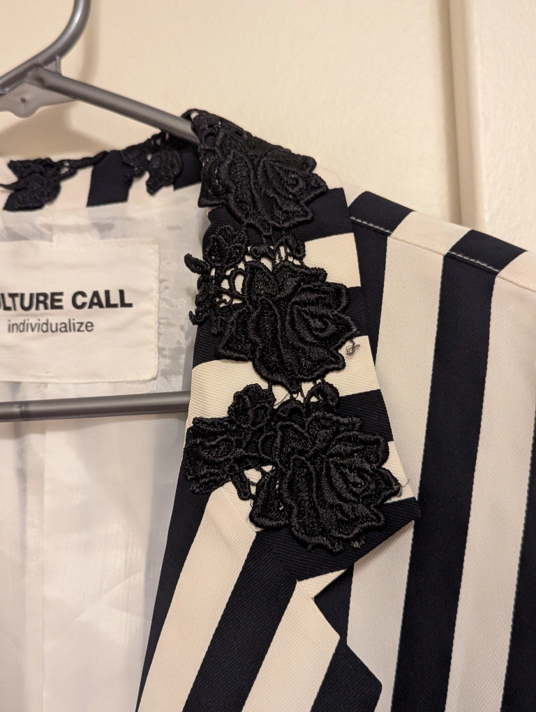Striped cropped blazer. Black and off-white vertical stripes. Features a unique black floral lace collar. long sleeves, oversized fit.