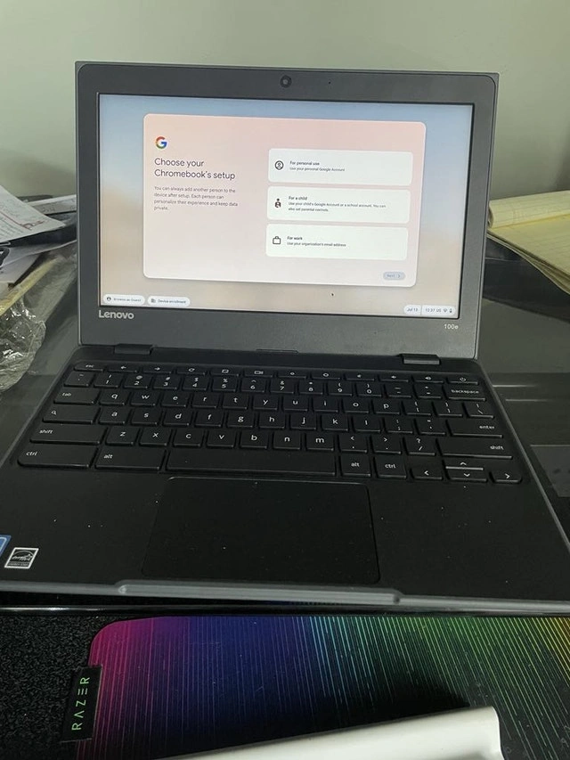 Lenovo 100e Chromebook laptop computer. Chromebooks operate using the Chrome Operating System (not Windows). We have a few of these available.