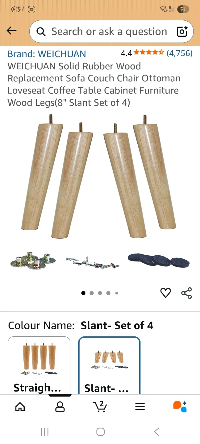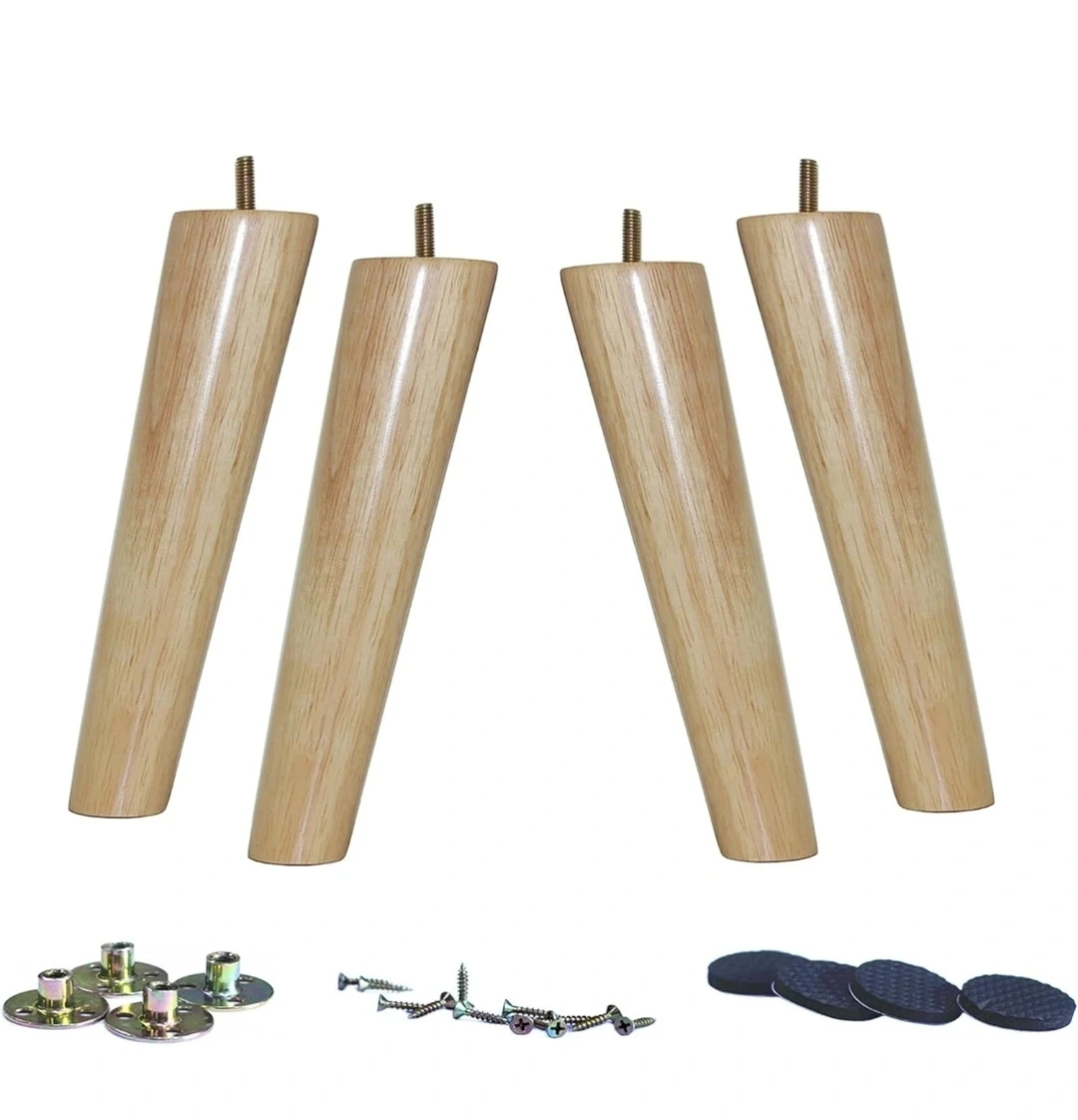 Set of four WEICHUAN solid wood furniture legs. Each leg is 8 inches long with a 2-1/4 inch top diameter. Includes mounting plates, screws, and protective pads for easy installation. Perfect for upgrading sofas, chairs, or cabinets!