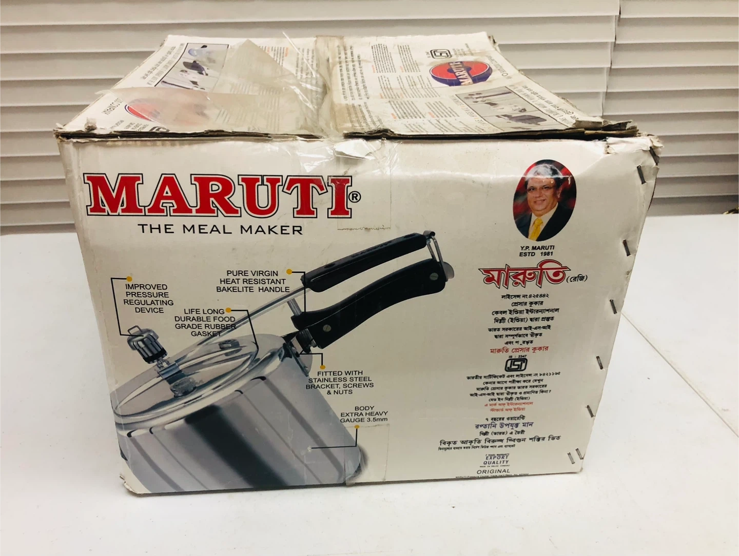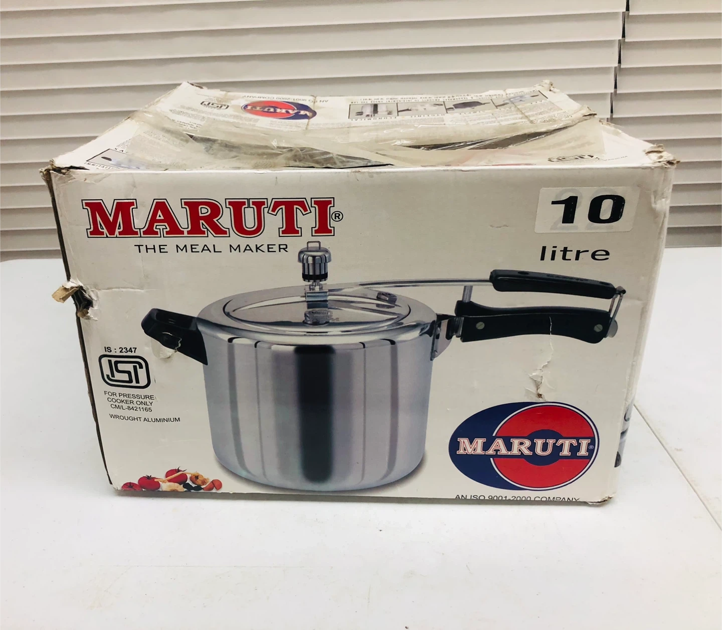 This is a Maruti The Meal Maker pressure cooker with a 10-litre capacity. It's made from wrought aluminium with a pure virgin heat resistant Bakelite handle. It features an improved pressure regulating device and durable food grade rubber gasket.
