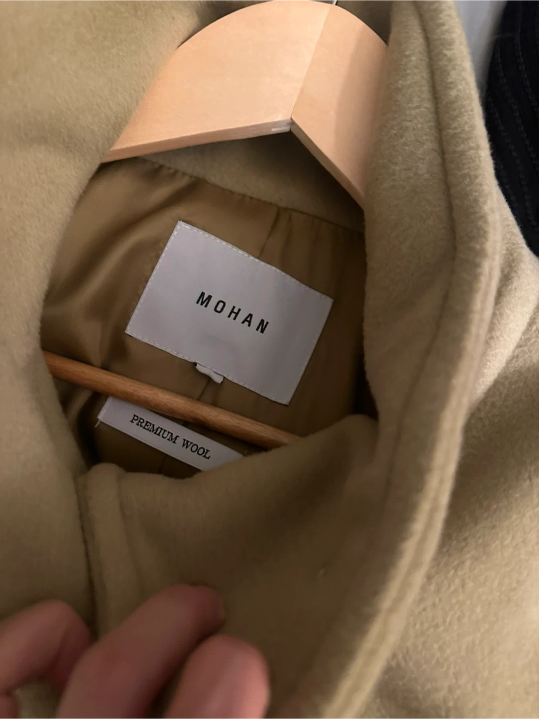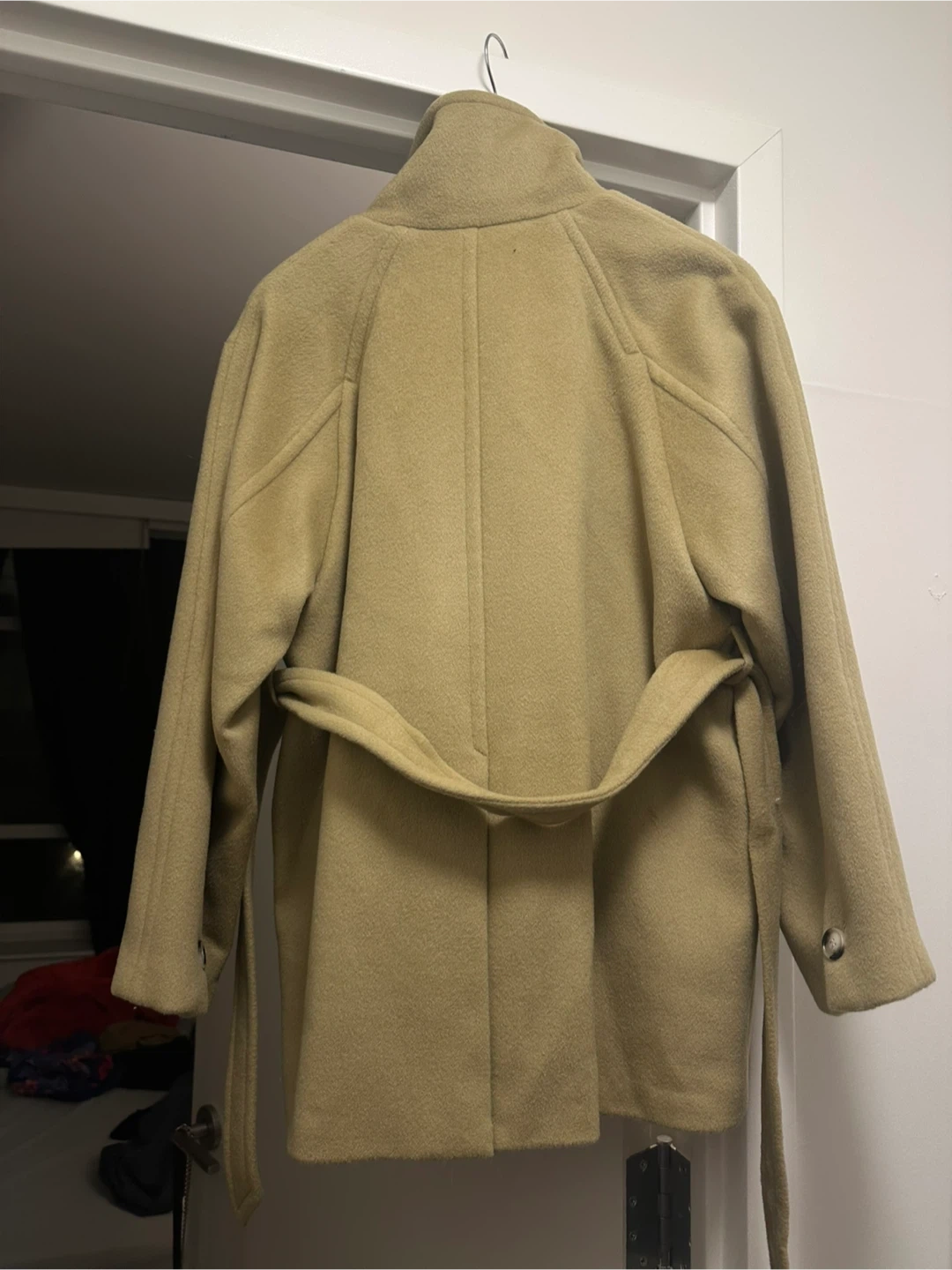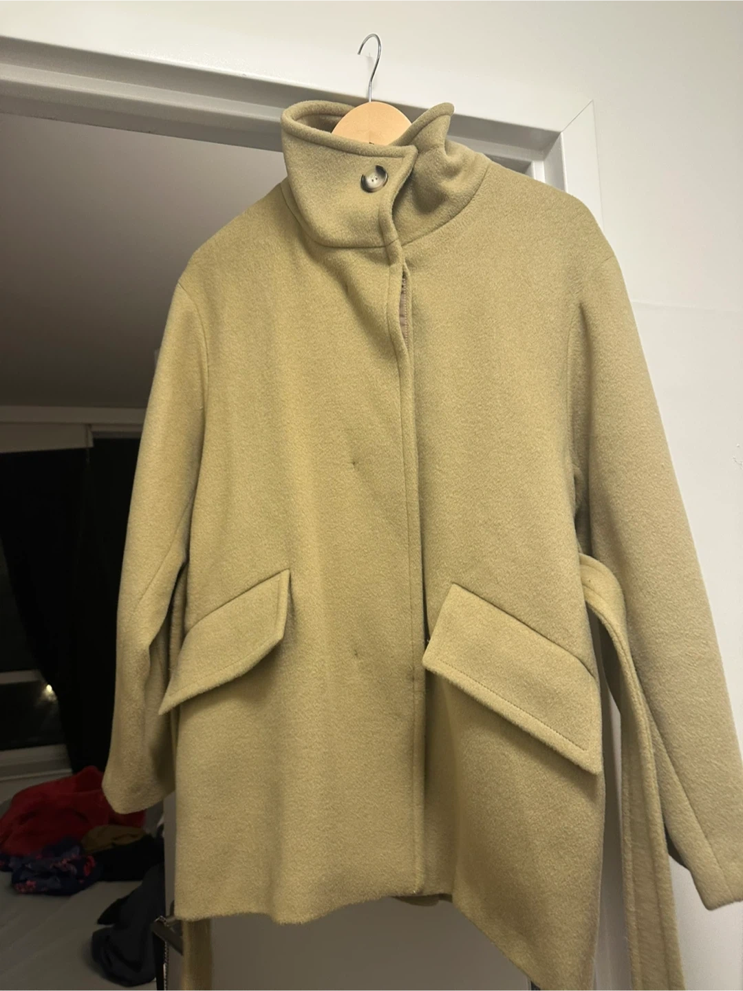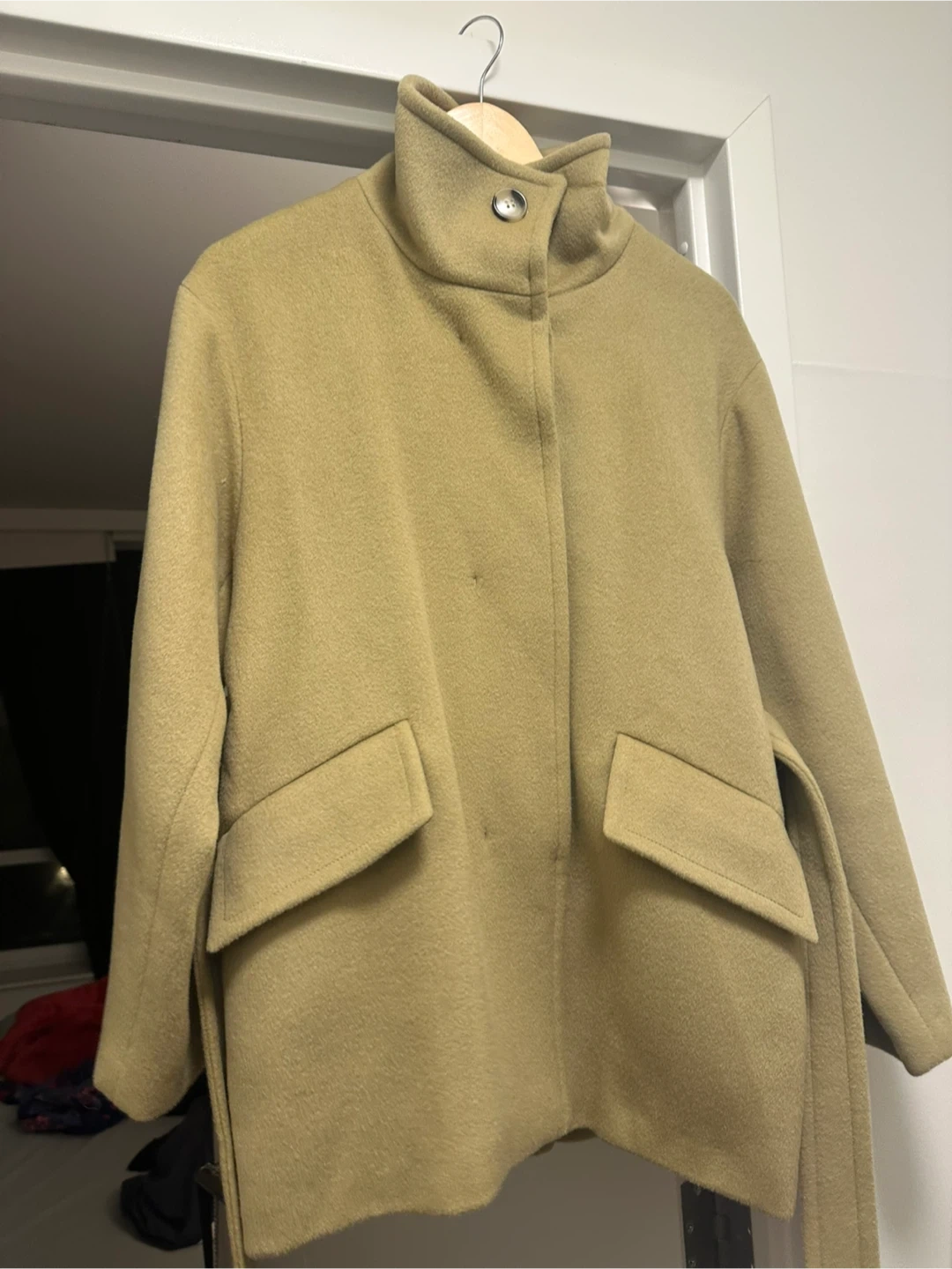 MOHAN premium wool coat. This stylish belted coat features a unique stand-up collar and front flap pockets. It's made from soft, high-quality wool. Perfect for cooler weather!