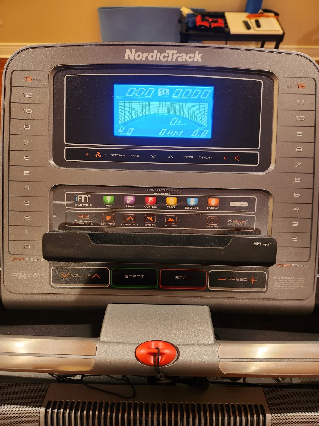 This NordicTrack treadmill features a 3.0 CHP motor and iFit compatibility. It has a digital display showing speed, time, distance, and calories. The treadmill also includes preset programs for varied workouts. IFIT compatible.