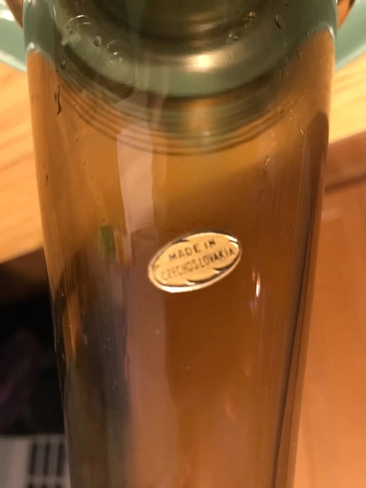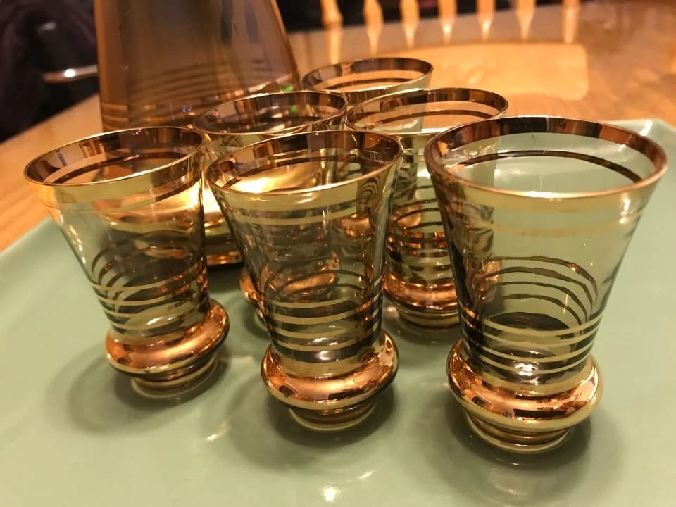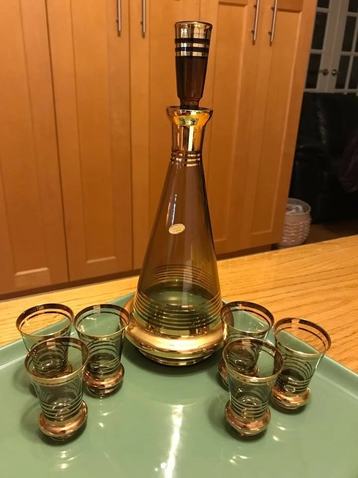 Vintage decanter with 6 shot glasses, amber color with embellished gold leaf. Made in Czechoslovakia. In great condition, no chips or cracks. Decanter: 9"H (11.25"H with topper). Shot Glass: 2.5"H. Pickup at Winston Churchill Blvd & Burnhamthorpe Rd W in Mississauga, ON.