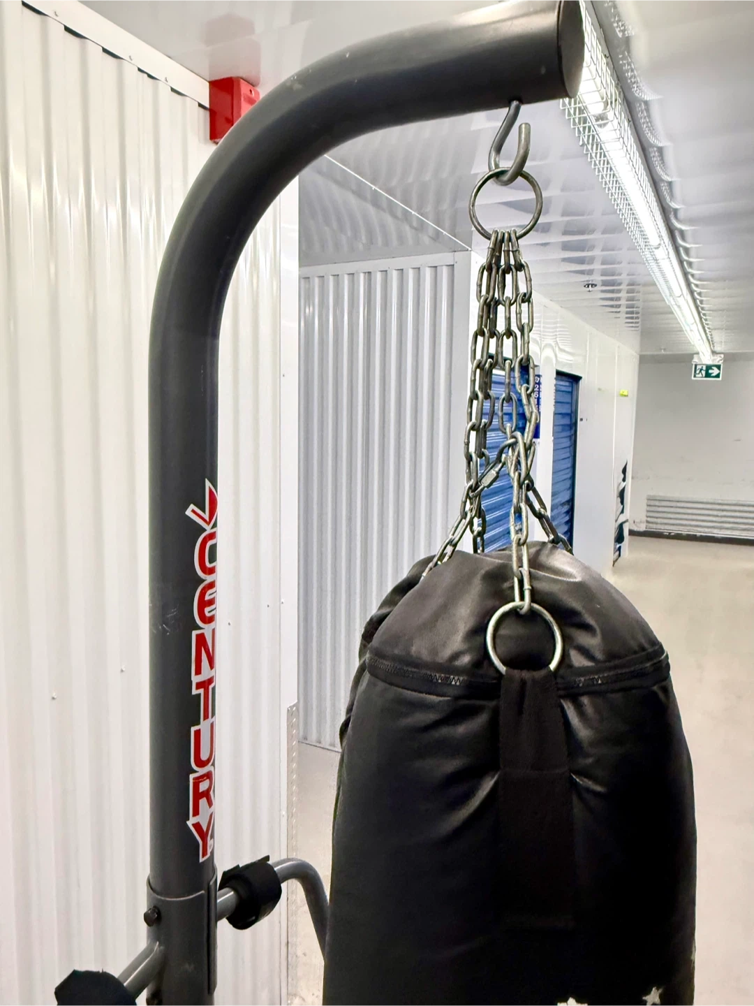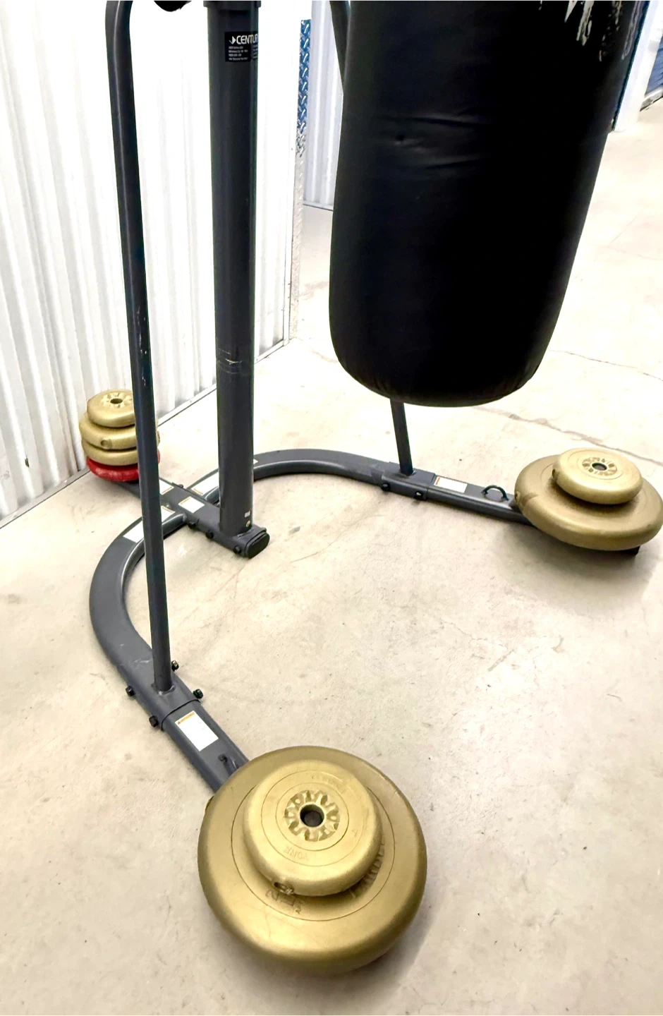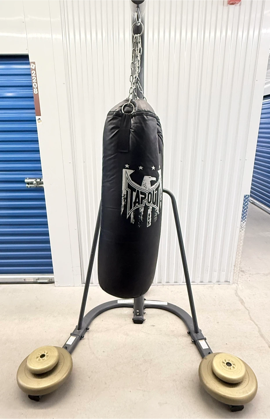 Century heavy bag stand with a TapouT punching bag. Includes weight plates for stability. Great for home workouts!