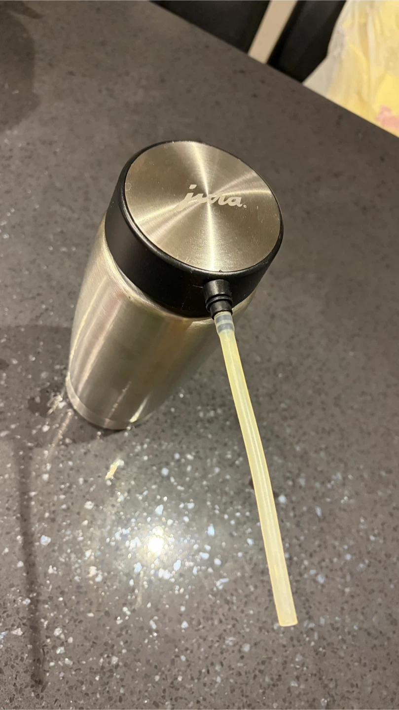 Jura stainless steel vacuum milk container. It's made of brushed metal with a black plastic lid and tube attachment. It has a capacity for 0.6 litres of cold milk storage for your Jura coffee machine. New sells for $175.00