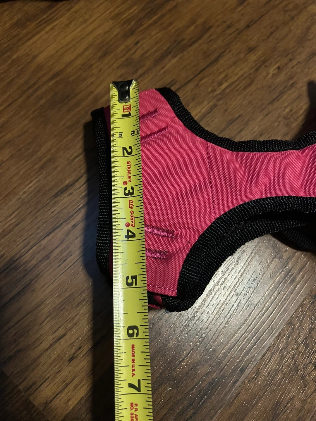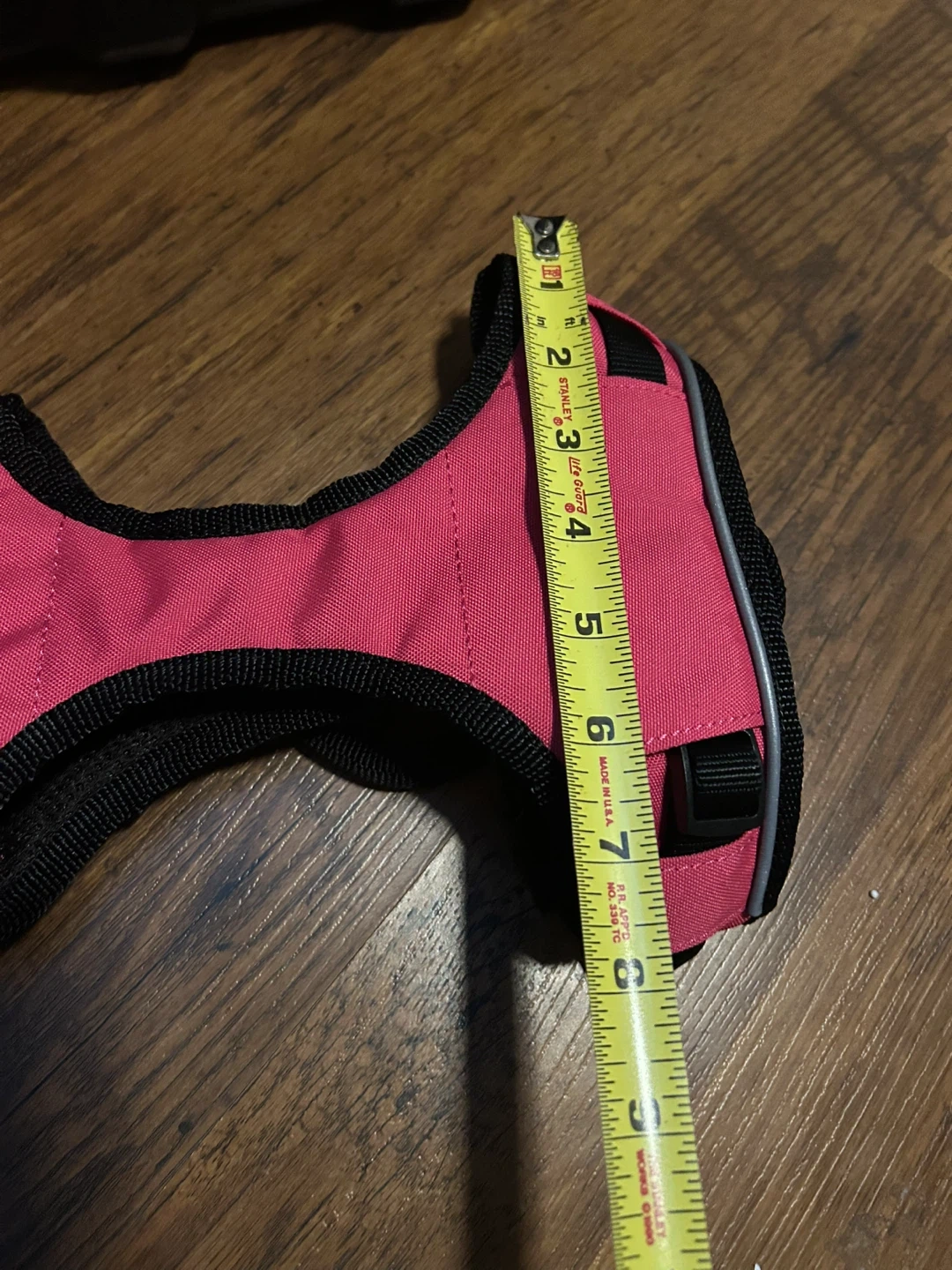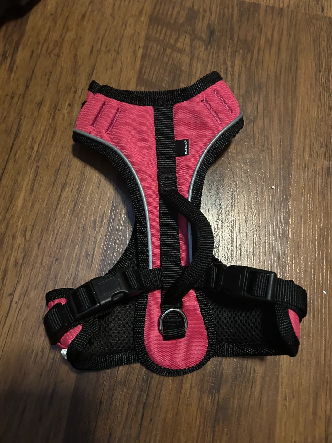 Selling a pink dog harness! It is a size small and in great condition. The harness is adjustable and comfortable for your furry friend. It measures approximately 7 inches in height and 9 inches in length.