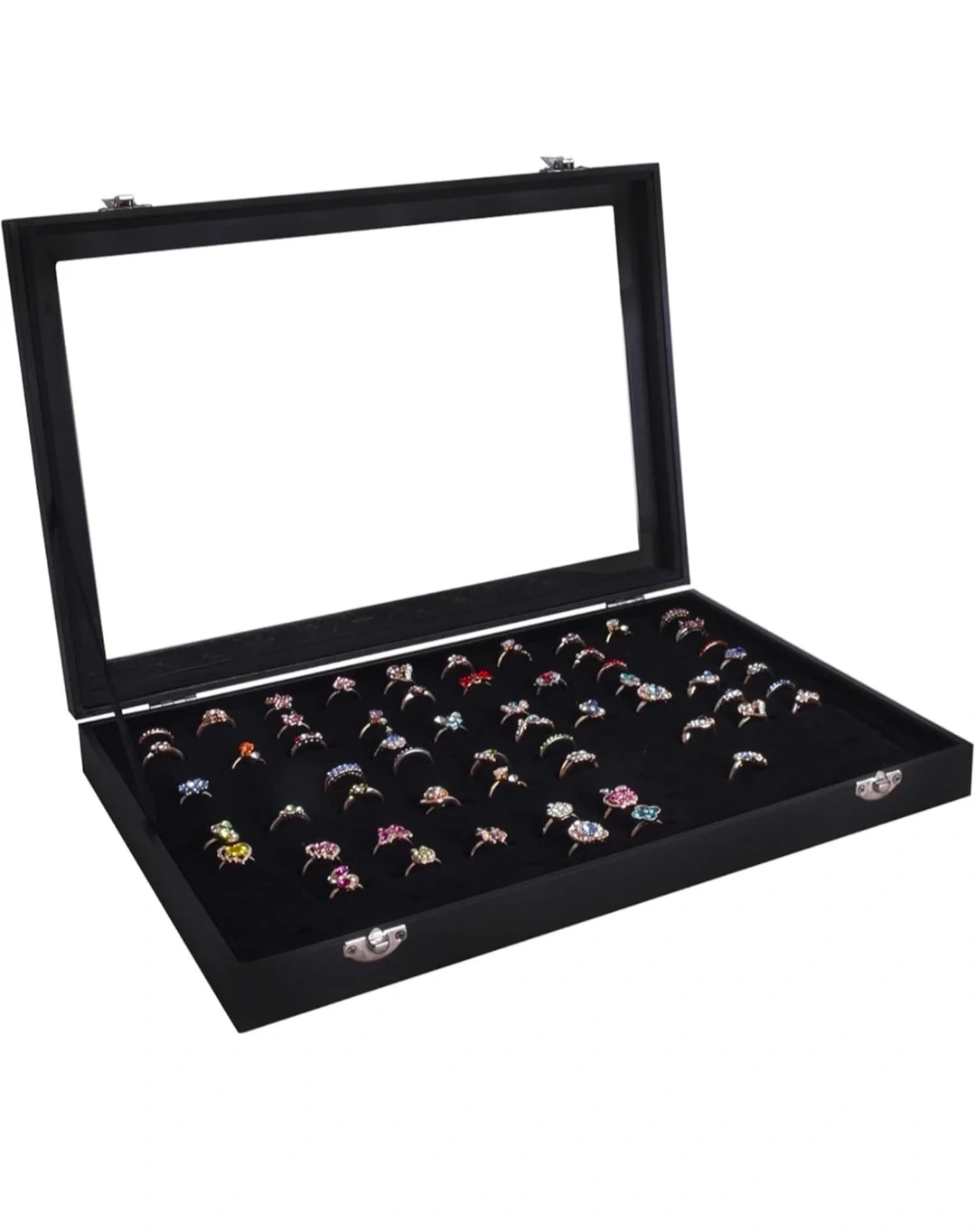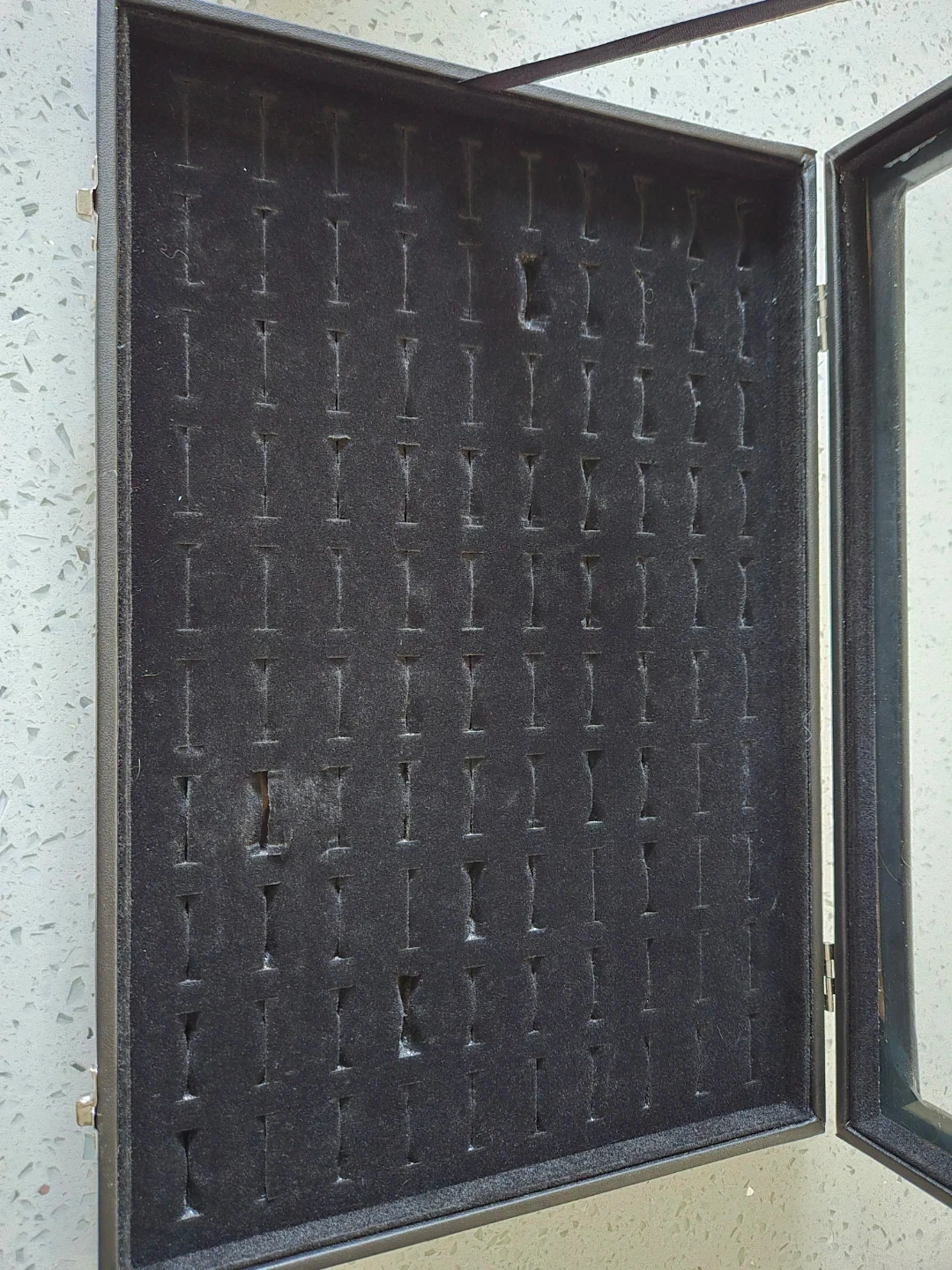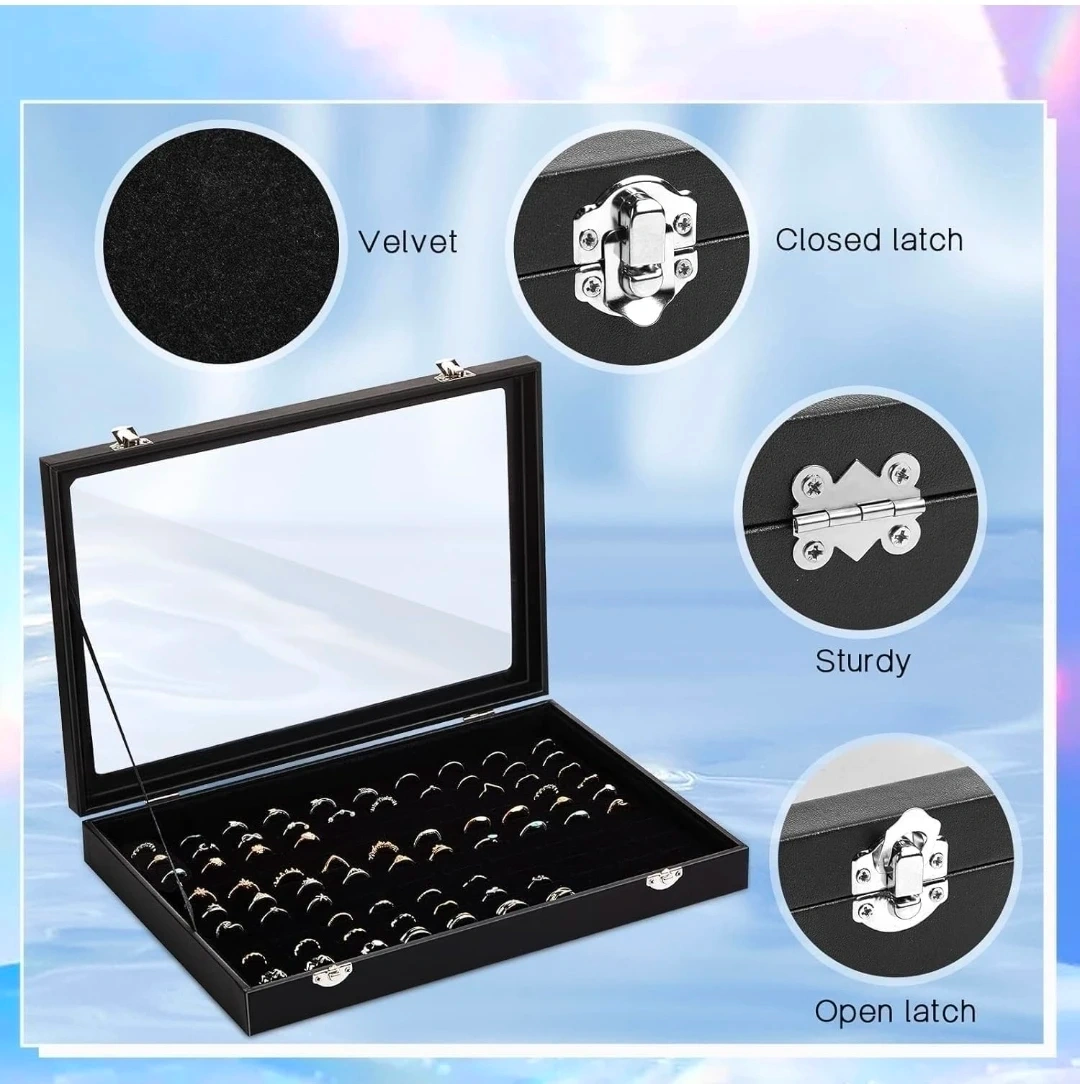 This black display case features a velvet lining with 100 slots for rings or earrings.