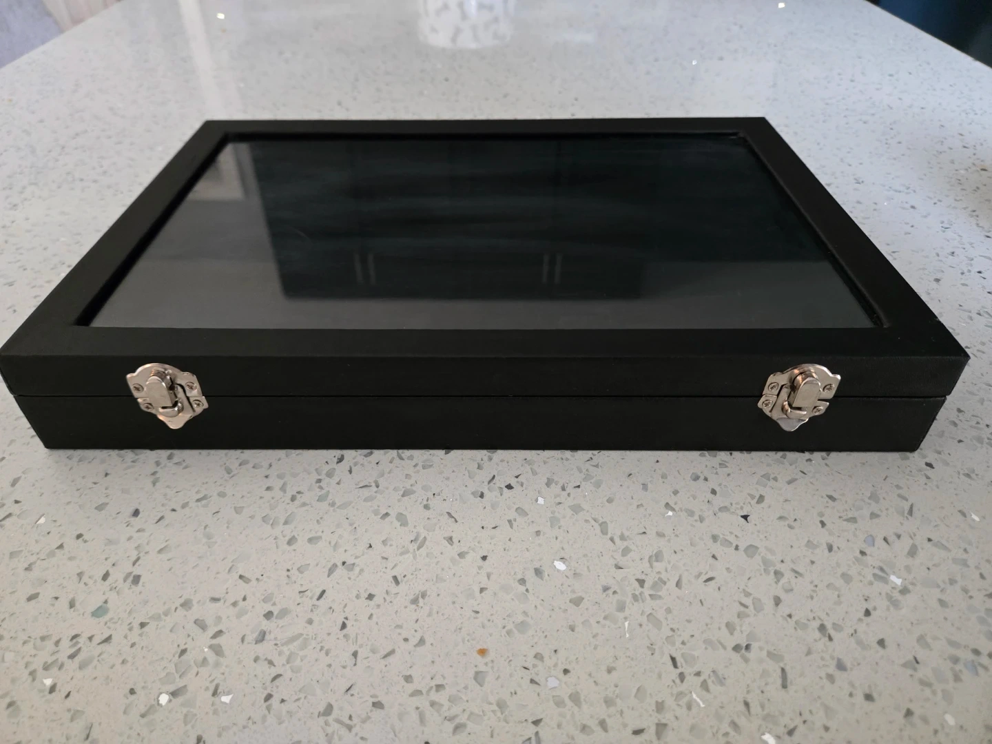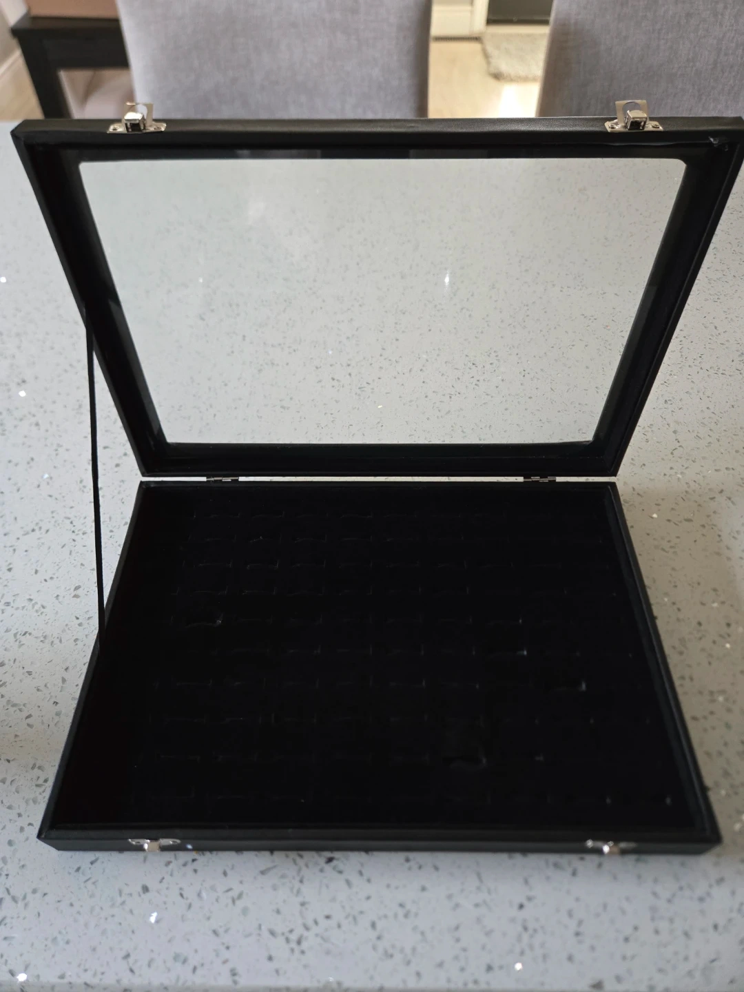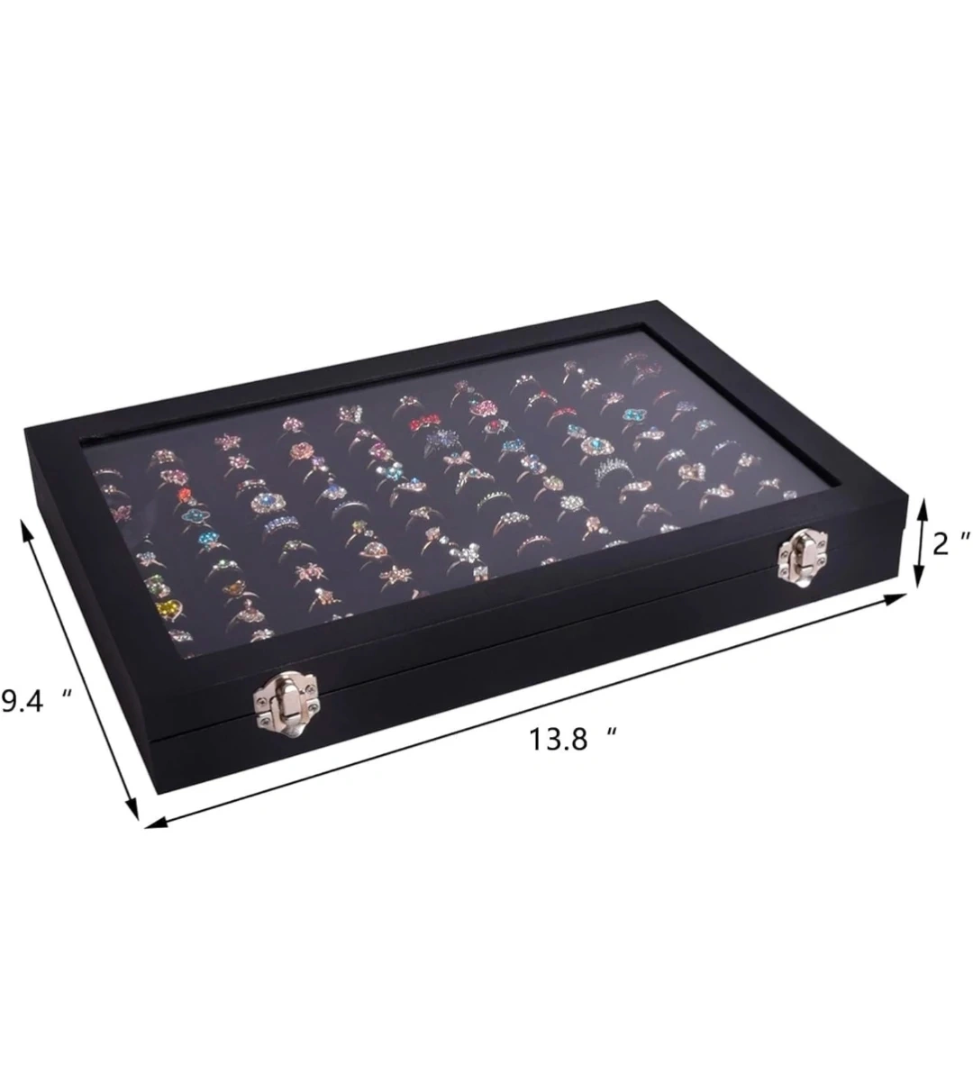 This black display case features a velvet lining with 100 slots for rings or earrings.