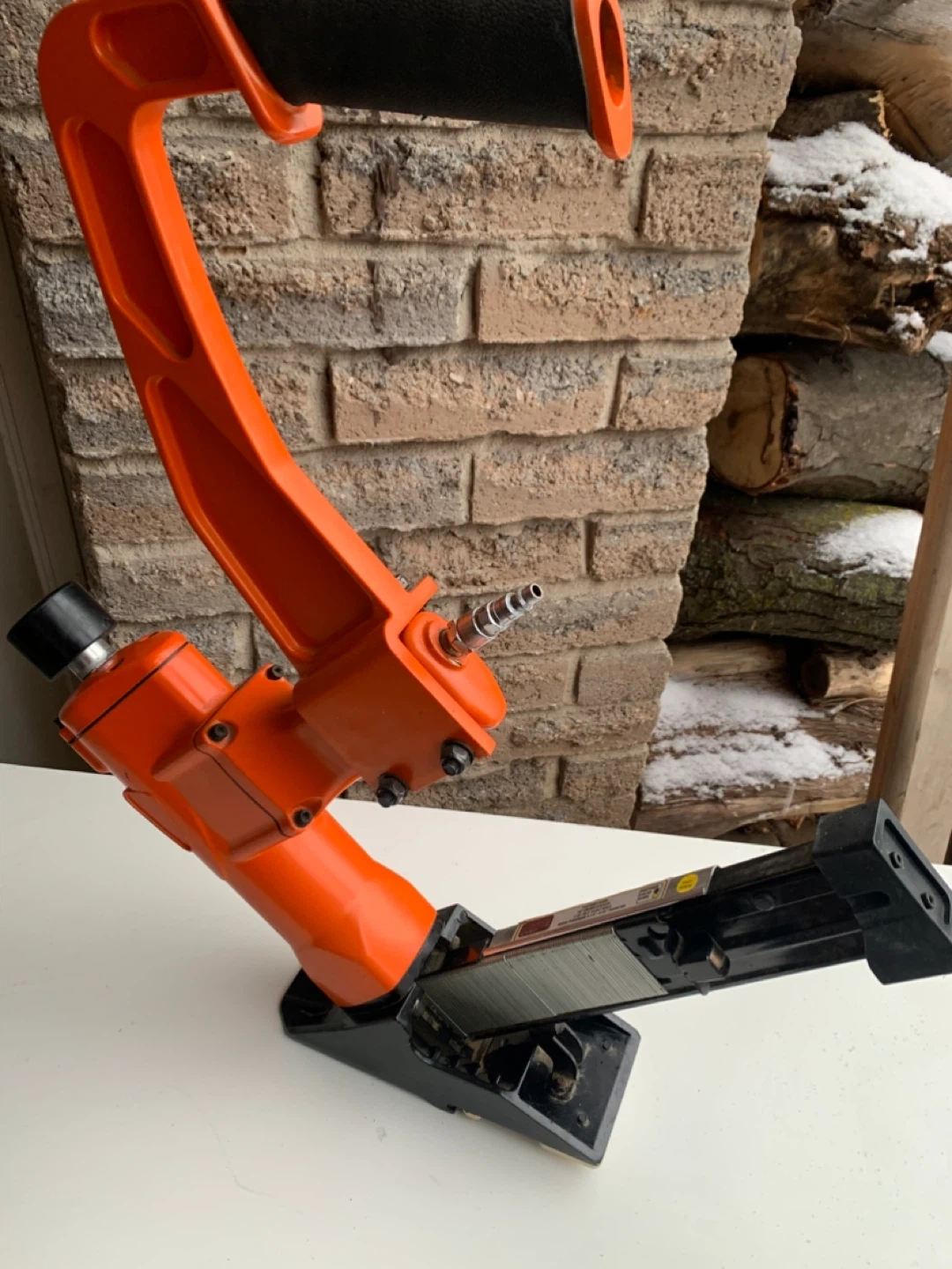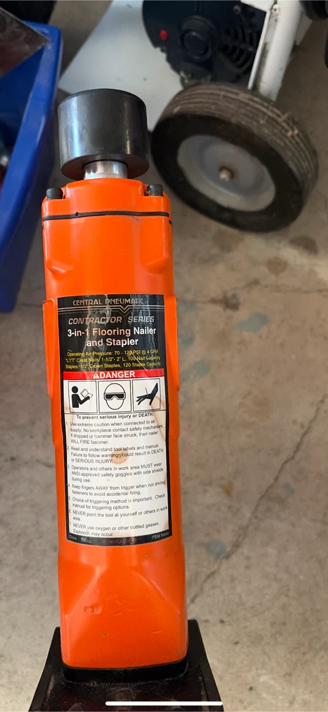 This Central Pneumatic 3-in-1 Flooring Nailer and Stapler is designed for contractors. It operates at 70-120 PSI and can drive 1-1/2" cleat nails or 1-1/2" L-shaped staples. It's great for flooring installation projects. Needs hammer.
