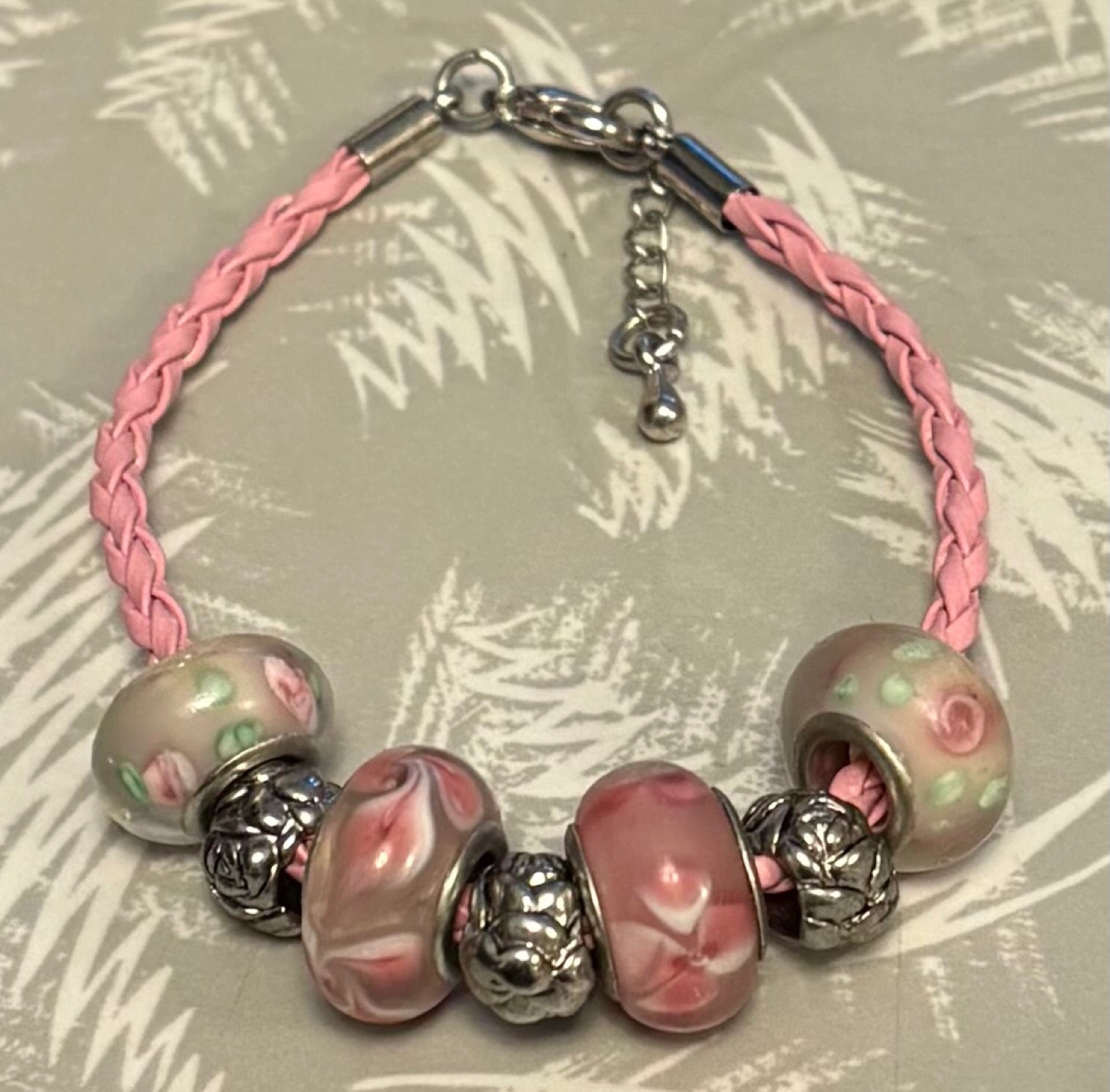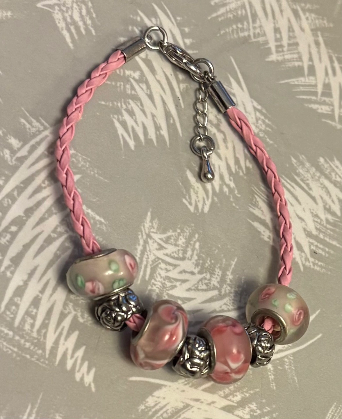 A cute pink bracelet with decorative beads! The bracelet features a braided pink band and a variety of beads in pink, silver, and cream colours. It's in great condition and ready for a new home! 🤩
