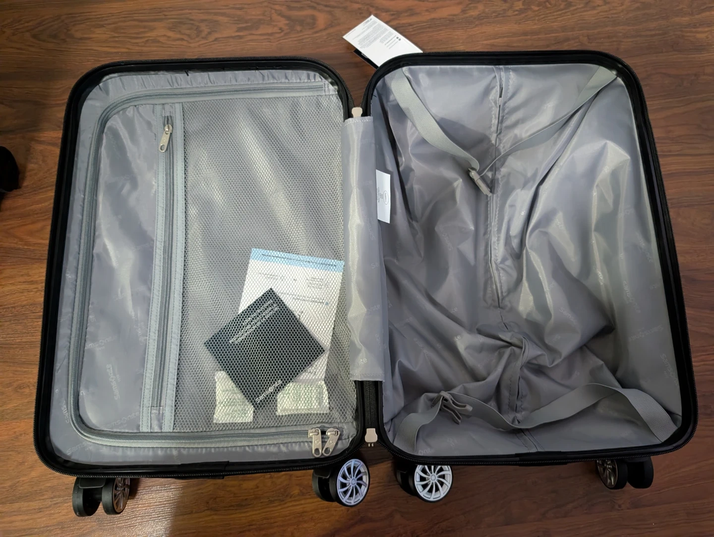 This is a Samsonite Rhapsody 360 spinner carry-on suitcase. It's made of rugged ABS material. It features dual spinner wheels, a TSA-approved lock, and an expansion zipper. The interior has a divider panel, cross-straps, and a mesh panel pocket.
