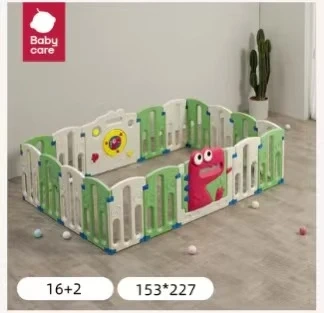 This is a Baby Care playpen, featuring white and green panels. It includes a dinosaur panel and a toy panel. The dimensions are 153x227 cm. It's suitable for babies and toddlers for a safe play space.