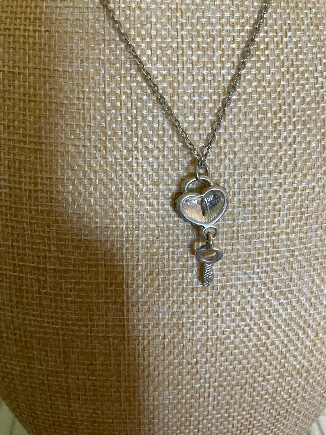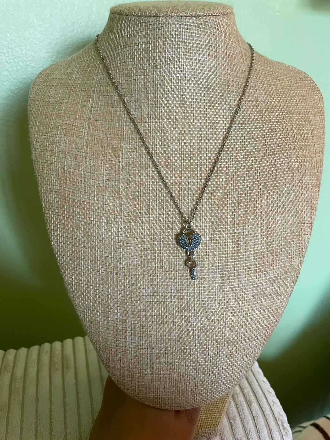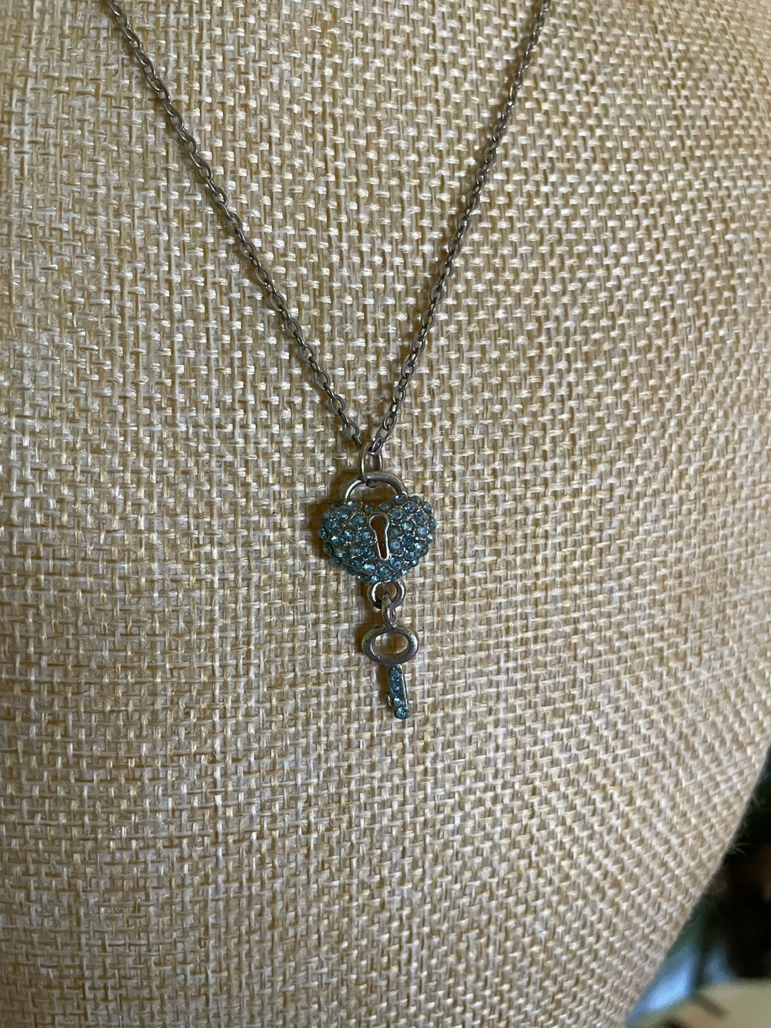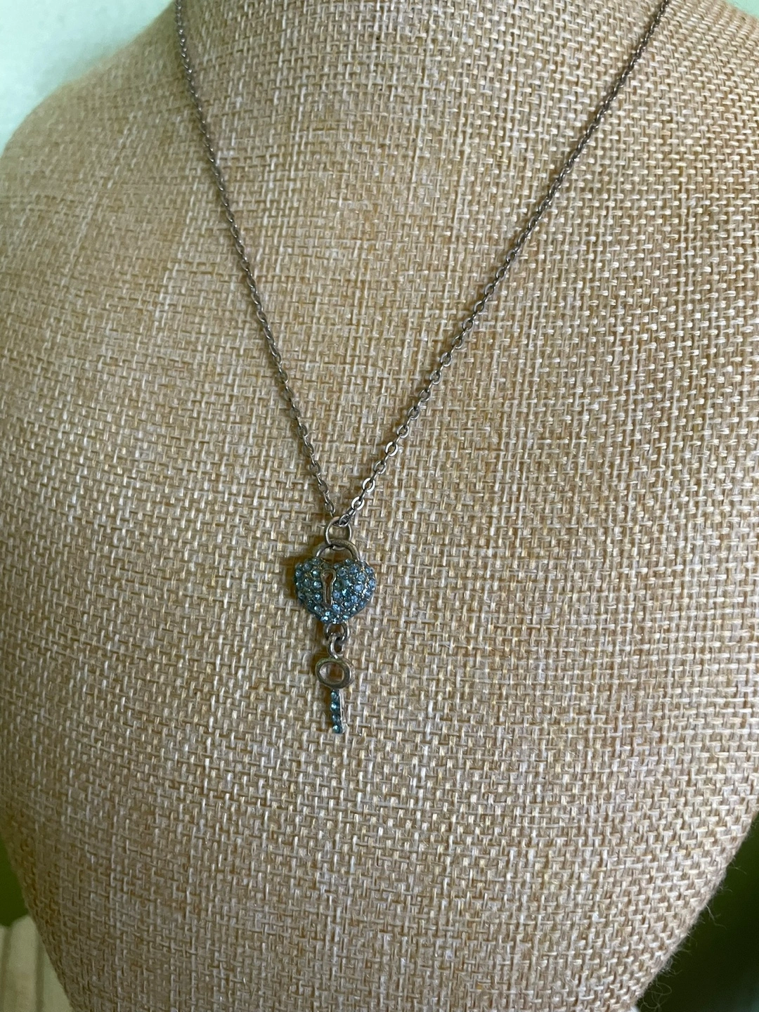Dainty necklace features a heart-shaped lock and key charm. Light blue crystals embellish the lock. Silver-toned metal chain and accents.