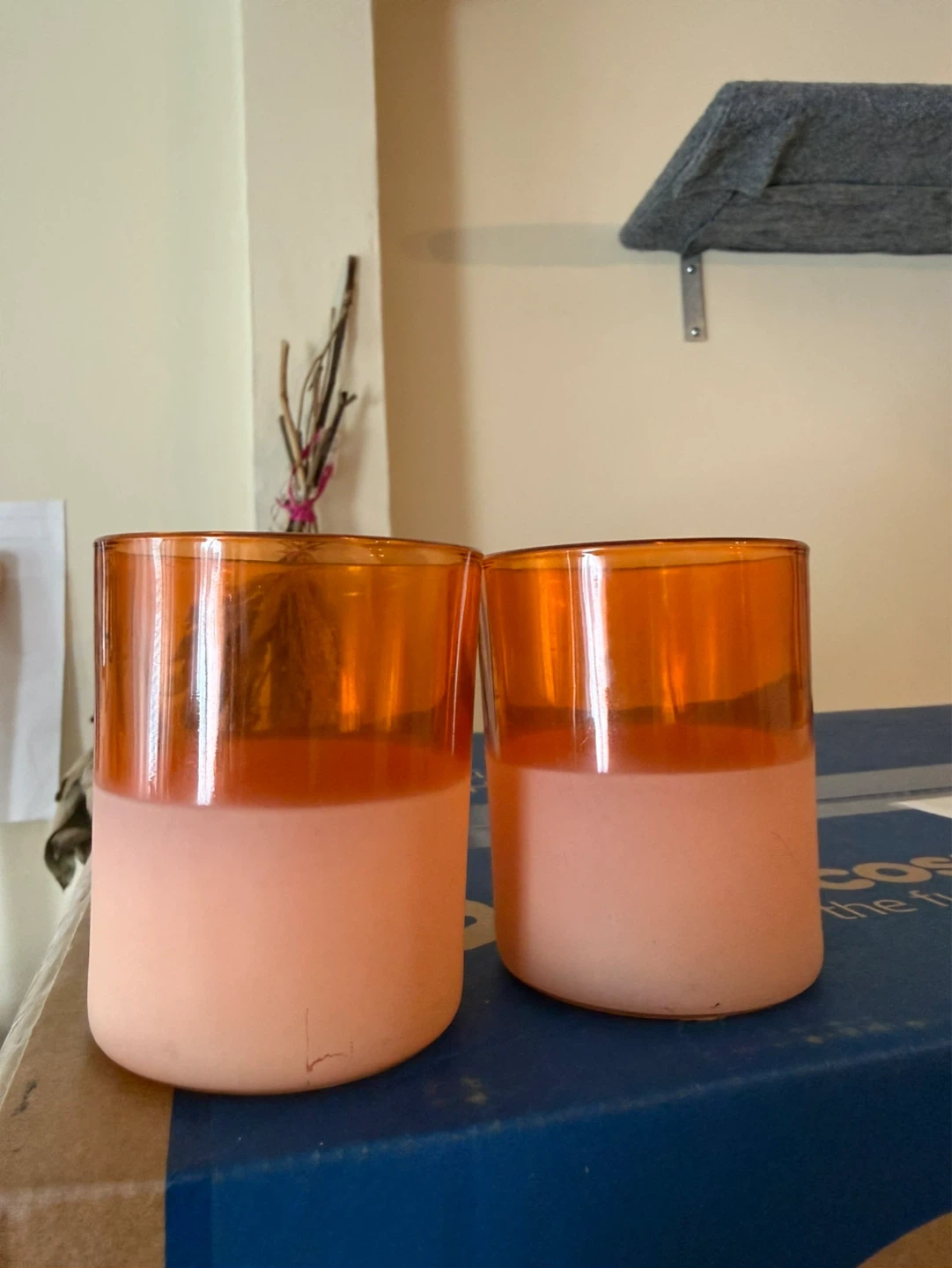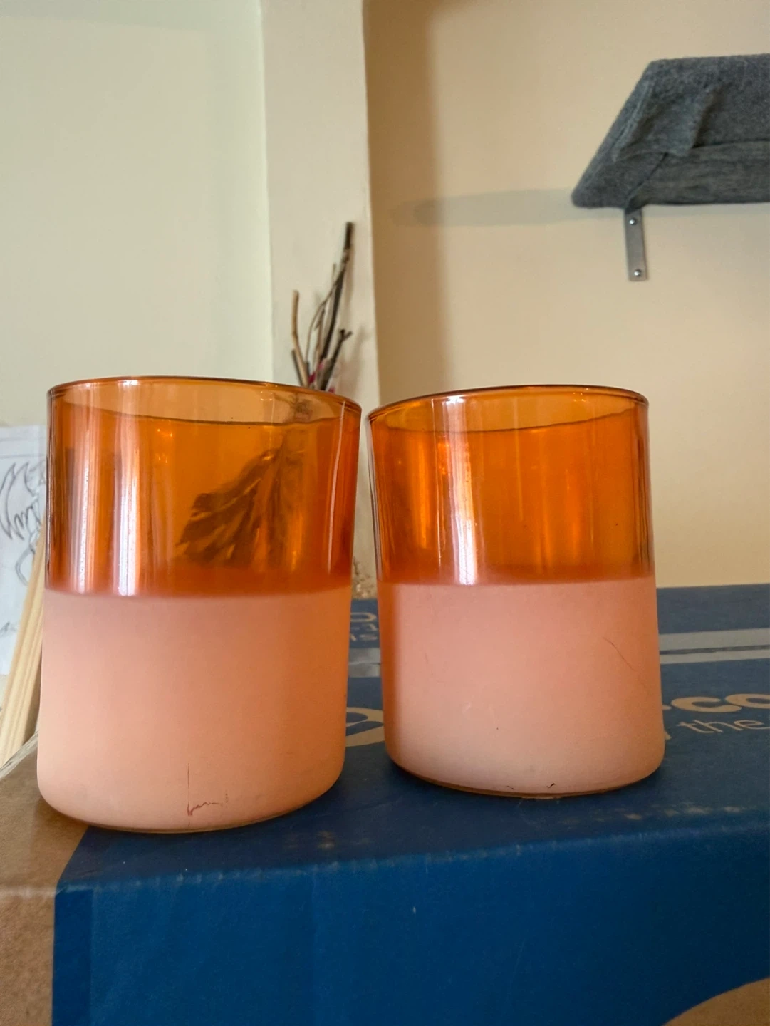 This set includes two orange and frosted glass candleholders. They're perfect for holding candles or as decorative accents.