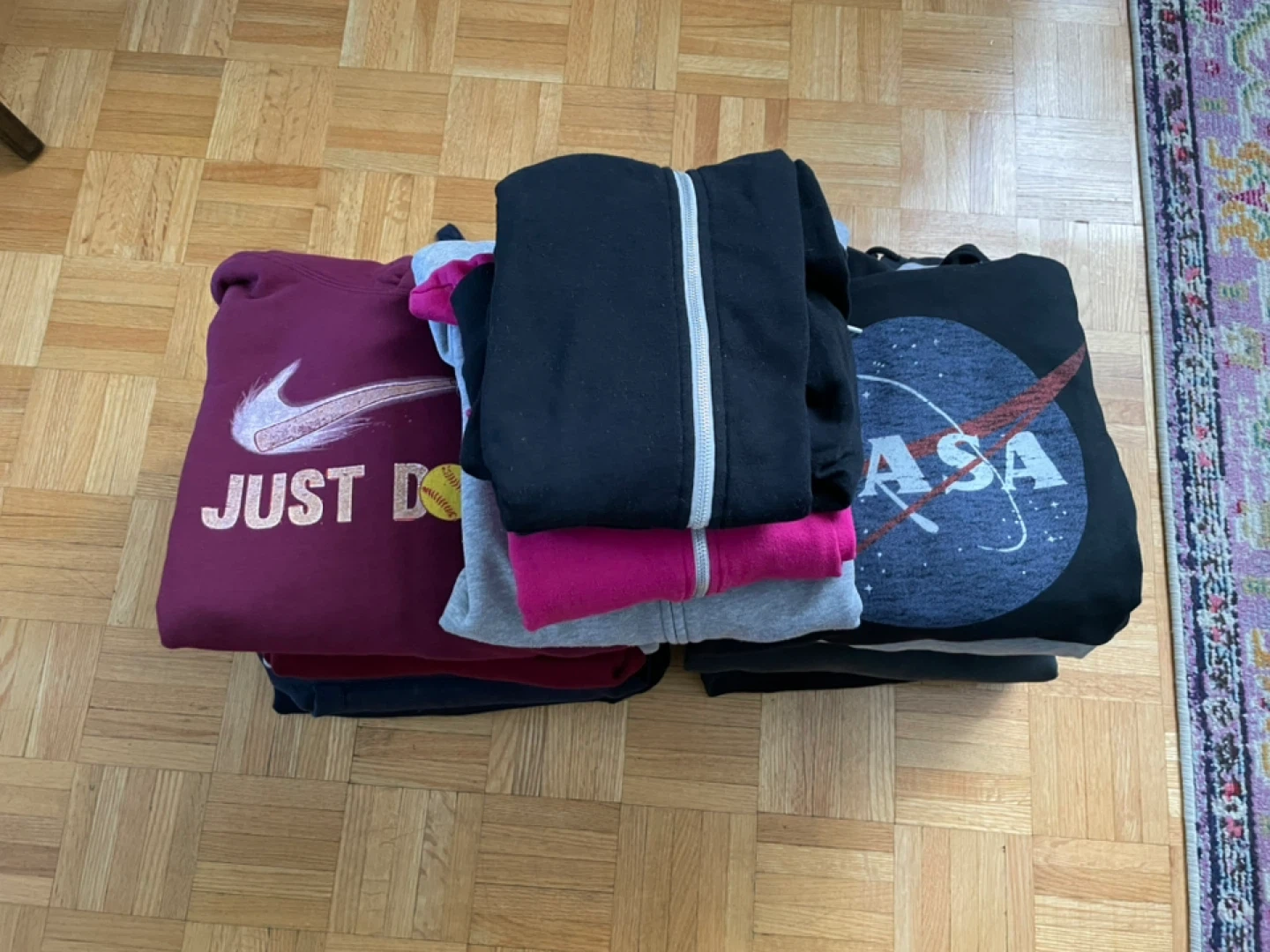 70$ Bundle includes a burgundy Nike hoodie with "Just Do It" graphic, a black NASA hoodie, and several other assorted hoodies. Mostly full-zip styles in various colours like grey, pink, and black. Great for everyday wear or layering!
