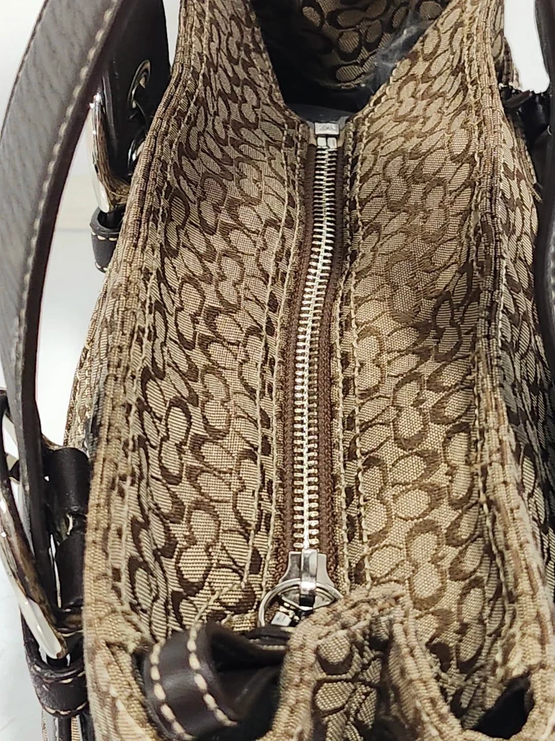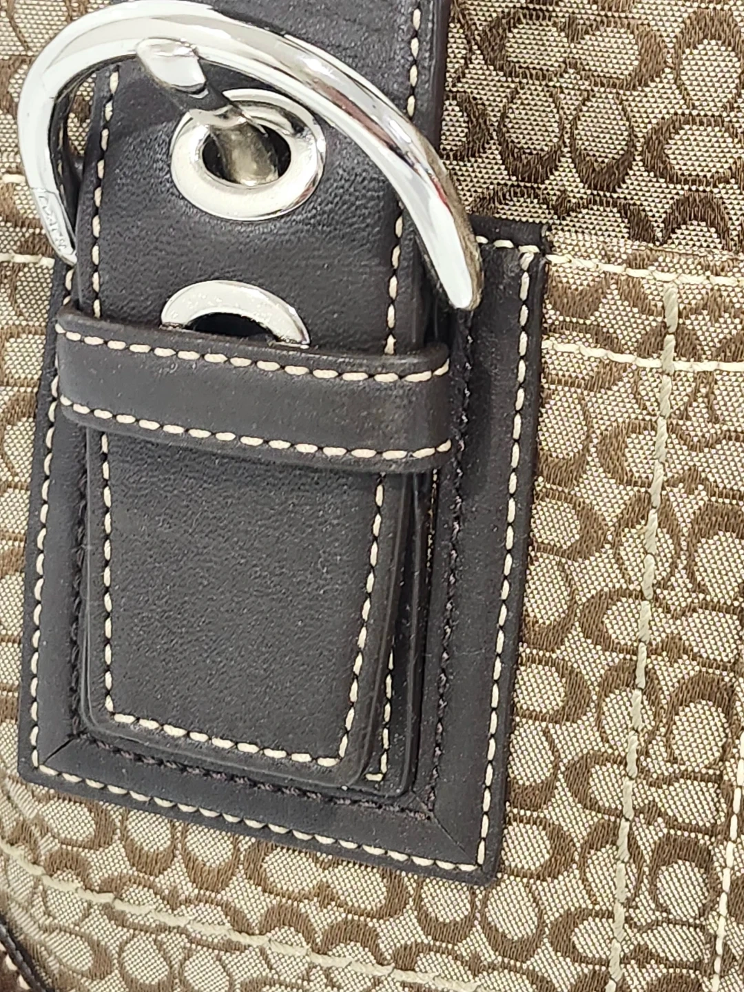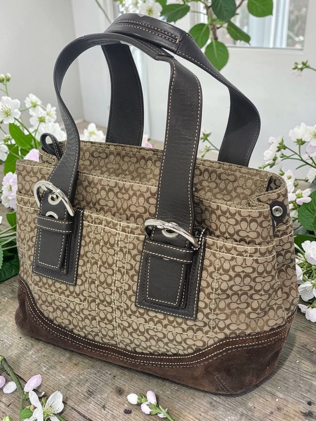 A classic Coach tote bag. It has dark brown leather handles and trim. This bag is perfect for everyday use!