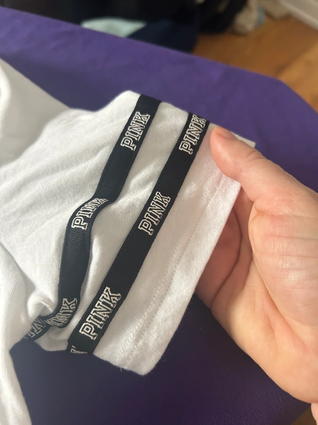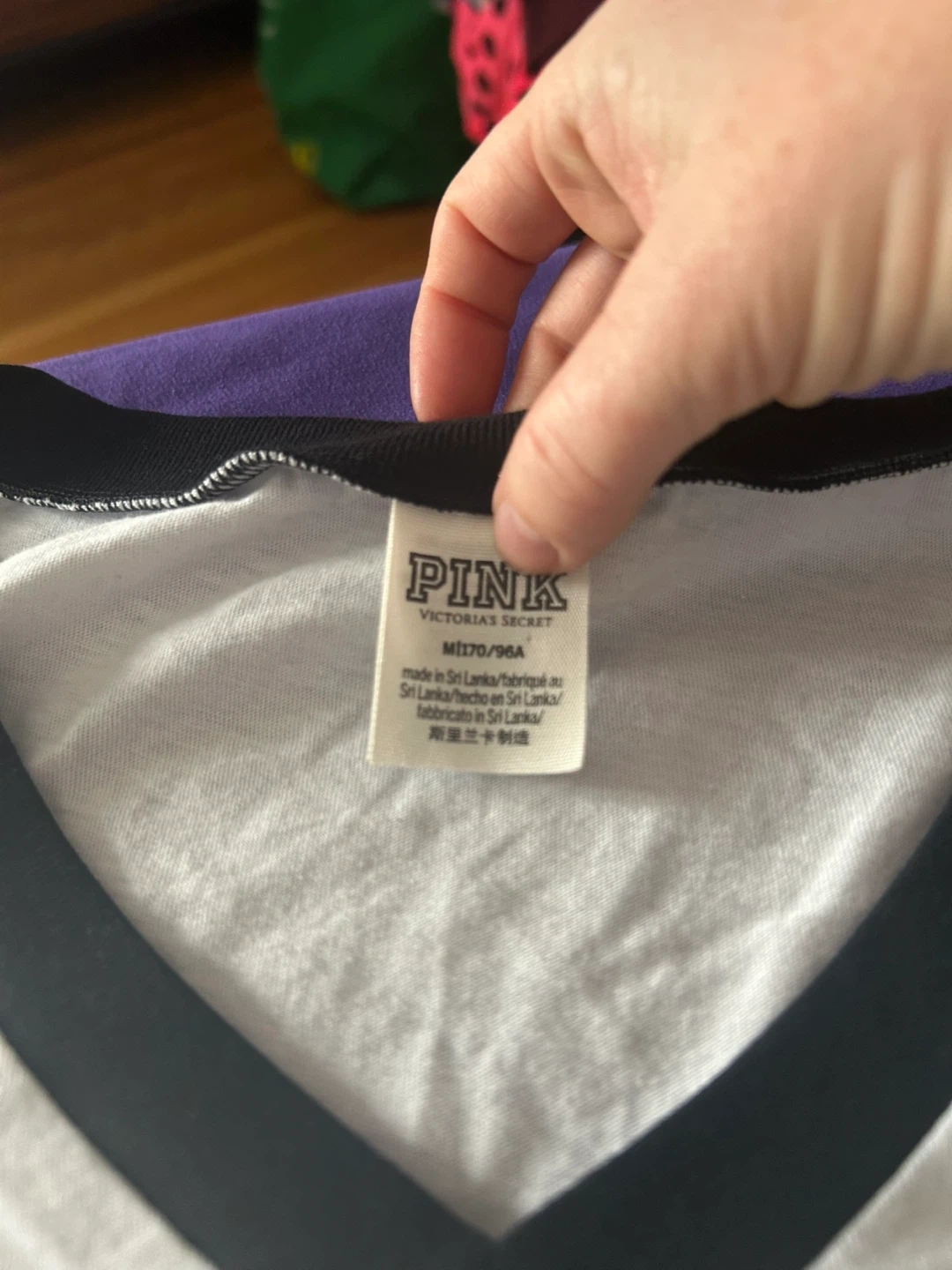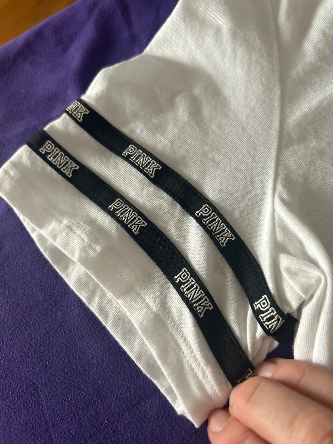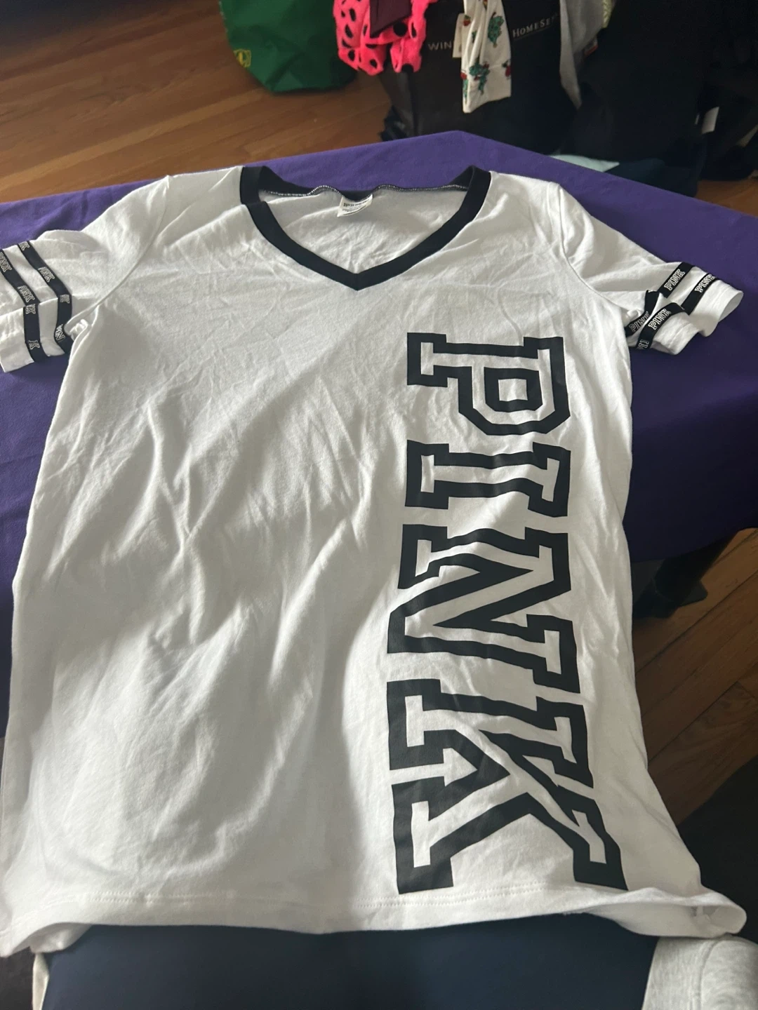 This is a white V-neck t-shirt from PINK Victoria's Secret. It features black trim on the neckline and sleeve cuffs, with 'PINK' repeated on the sleeve bands. The shirt is size M and made in Sri Lanka.