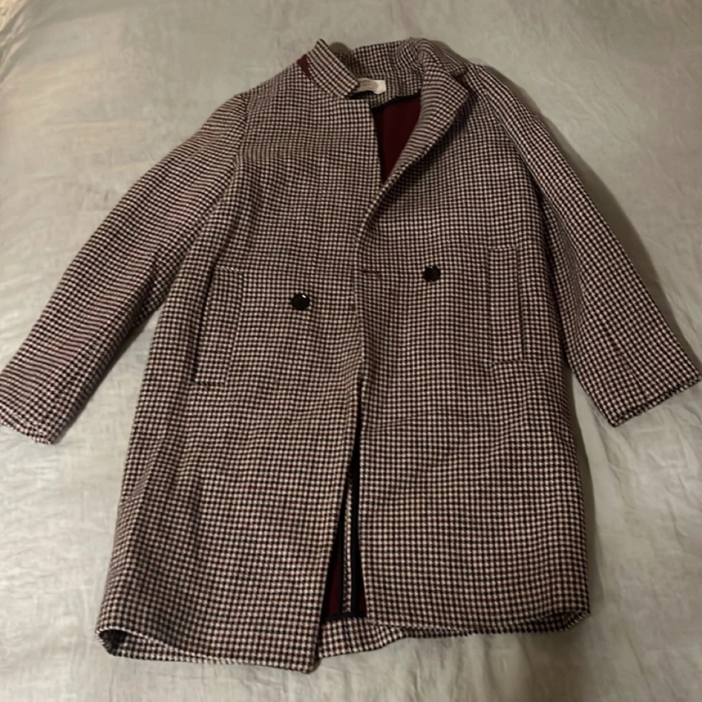 Adorable set, unfortunately too small for me now. Navy, maroon and beige. Coat measures approximately 33-34" from shoulder to hem in length. In great condition with little to no signs of wear. Paid over $200 plus tax