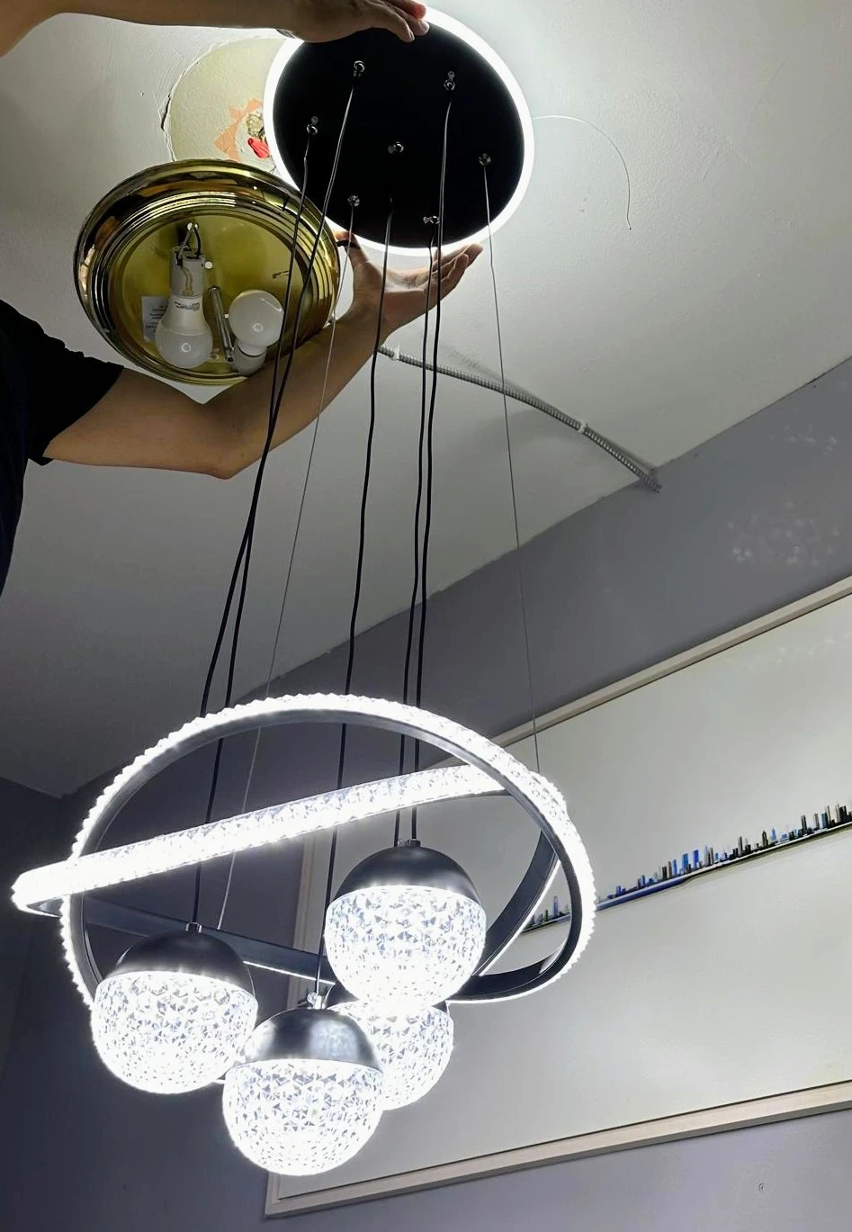 This modern pendant light features a stylish ring design with durable, high-quality acrylic and four hanging globe lights. It's perfect for adding a touch of elegance to any dining room or living area. Uses LED lighting.