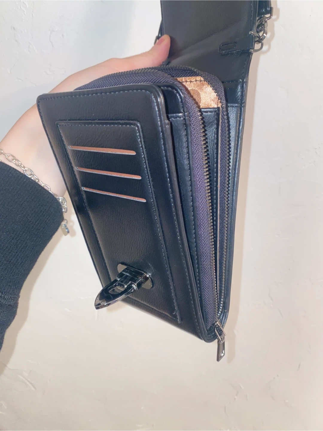 Black studded wallet with crossbody strap
