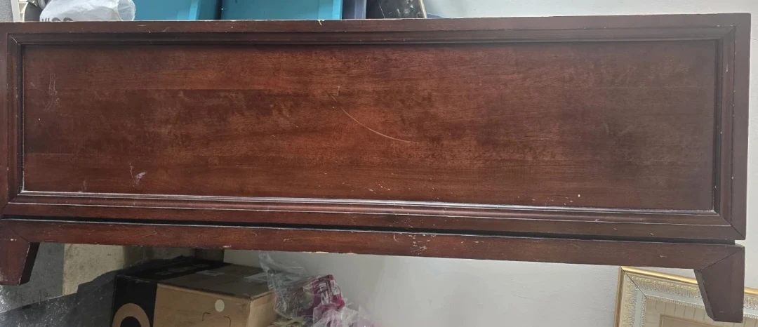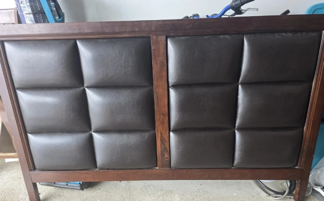 Queen bedframe.This headboard features dark brown upholstered panels within a wooden frame. All frame parts are available.