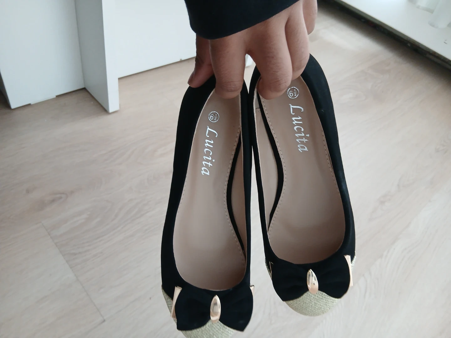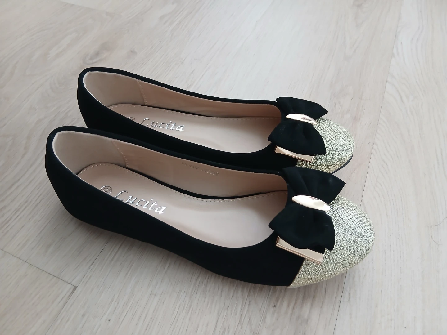Cute black ballet flats with a sparkly gold toe cap and a bow detail. They're made with a soft black material and feature a comfortable sole. Perfect for adding a touch of glam to your everyday outfits!