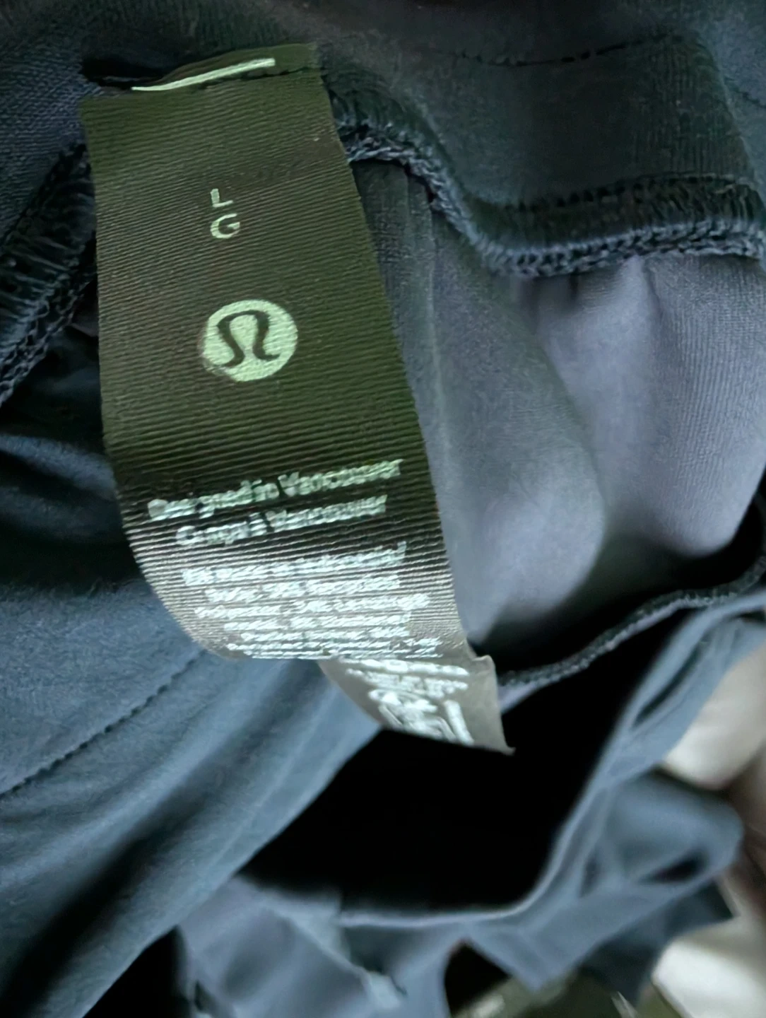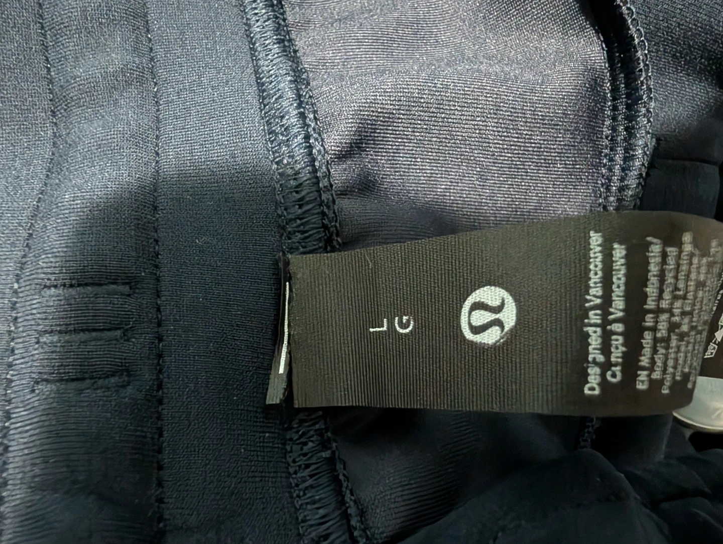 These navy blue Lululemon joggers are designed in Vancouver. Made in Indonesia with a blend of recycled polyester and lyocell. Comfortable for everyday wear.