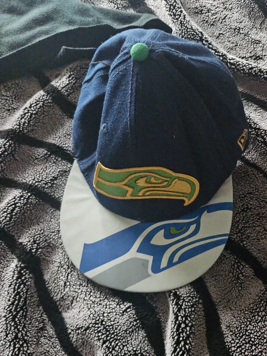 This is a New Era Seattle Seahawks baseball cap. It's navy blue with the team's logo on the front. The bill has a complementary design. It's a stylish way to show your team spirit!
