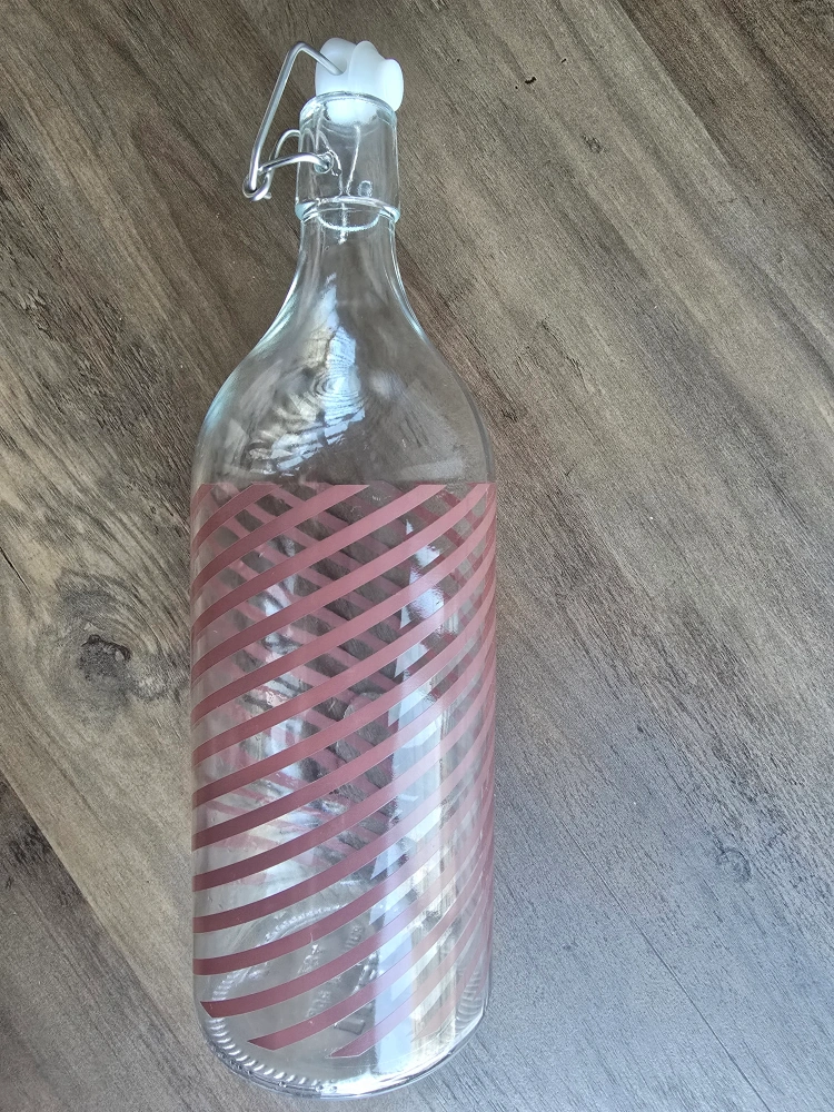 Here's a glass bottle with a unique pink striped design! It's perfect for storing water or juice, and the swing top lid ensures a tight seal. It's in great condition and ready for a new home