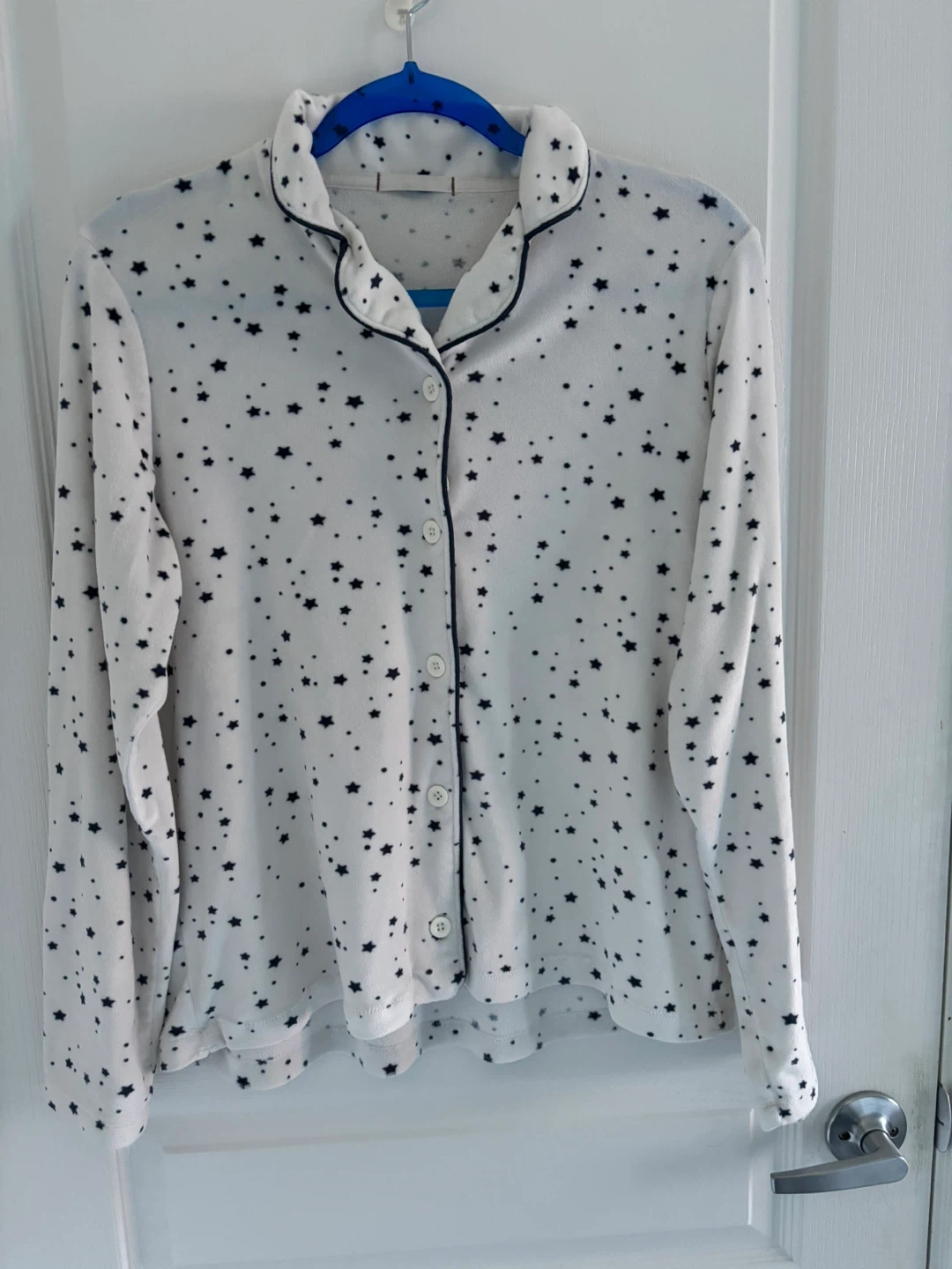 This is a two-piece pajama set featuring a long-sleeved top and matching pants. The set is white with a dark blue star pattern. The top has a collared neckline and buttons down the front. It's made of soft fabric for comfort.