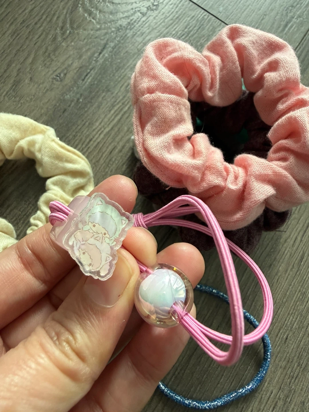Includes various colours and a pink elastic hair tie with a charm.