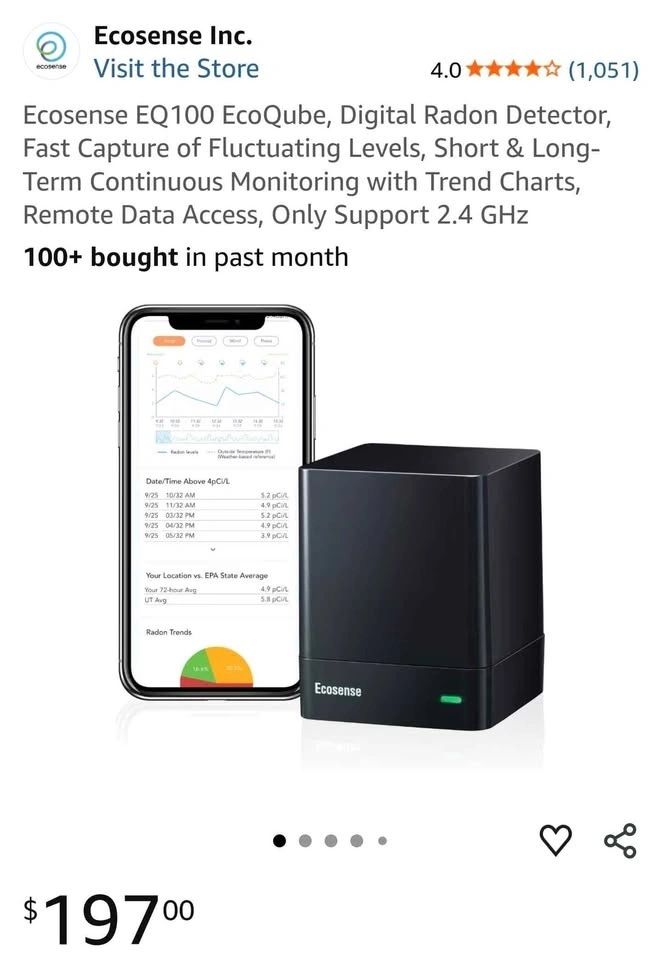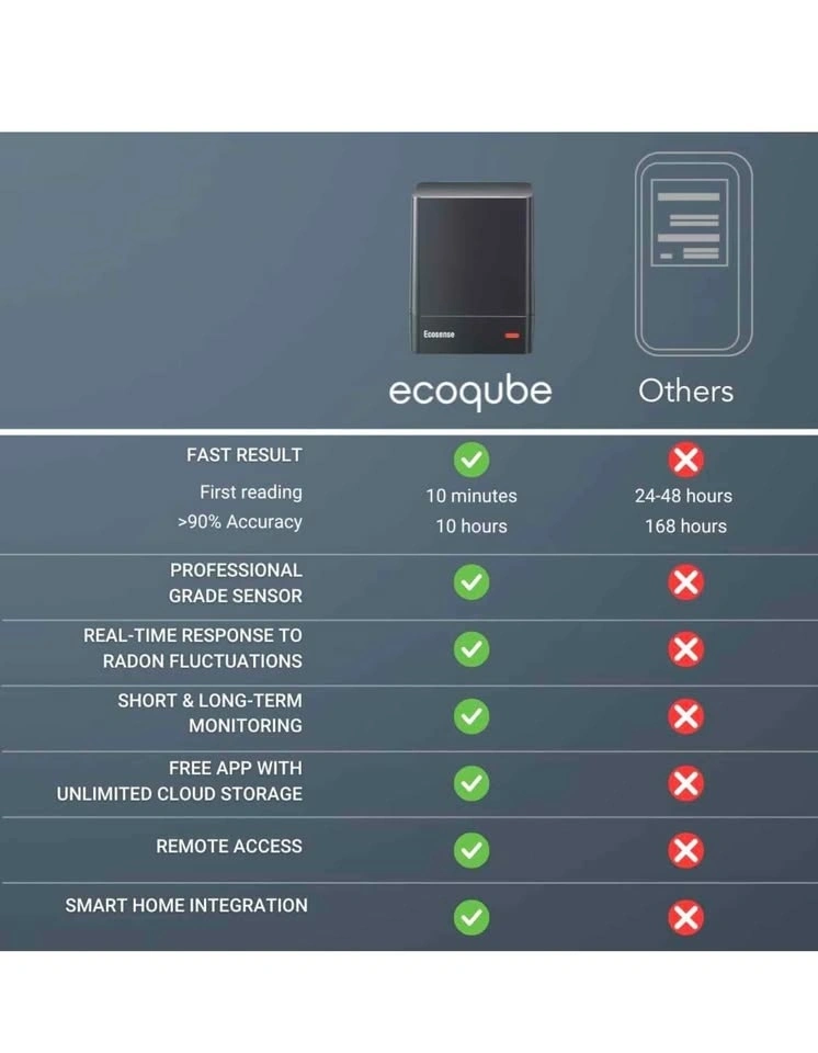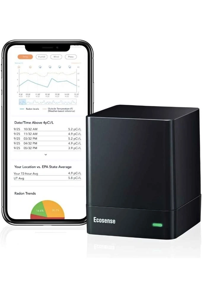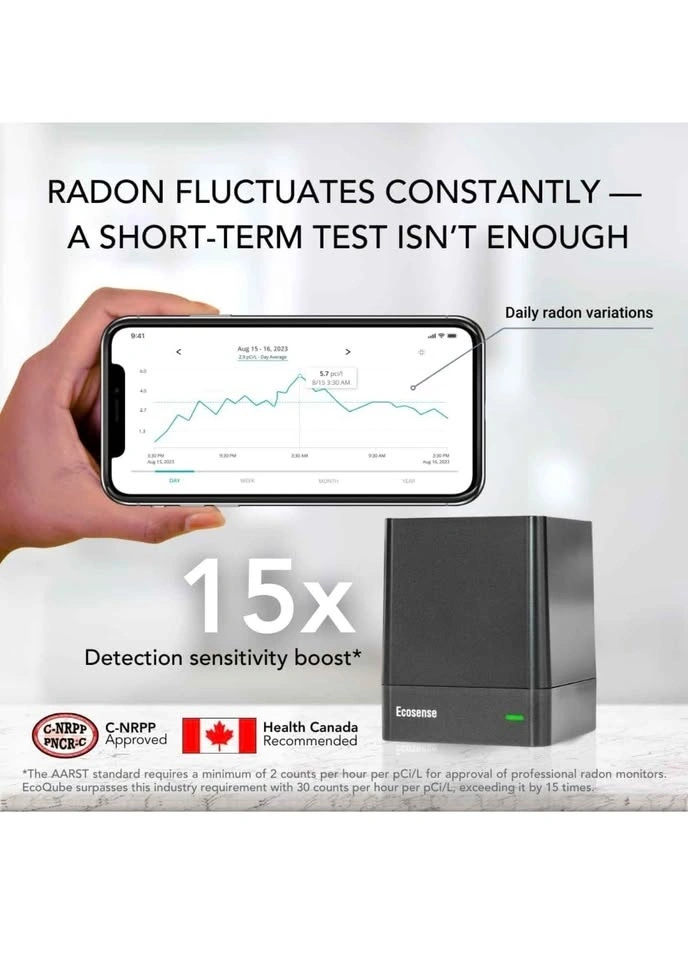 Reliable Ecosense EcoQube smart radon detector. Measures radon gas levels. Connects to an app for real-time data and alerts. Works with IFTTT for smart home automations. Fast first readings and accurate results. C-NRPP approved, Health Canada recommended. Keep your home safe.