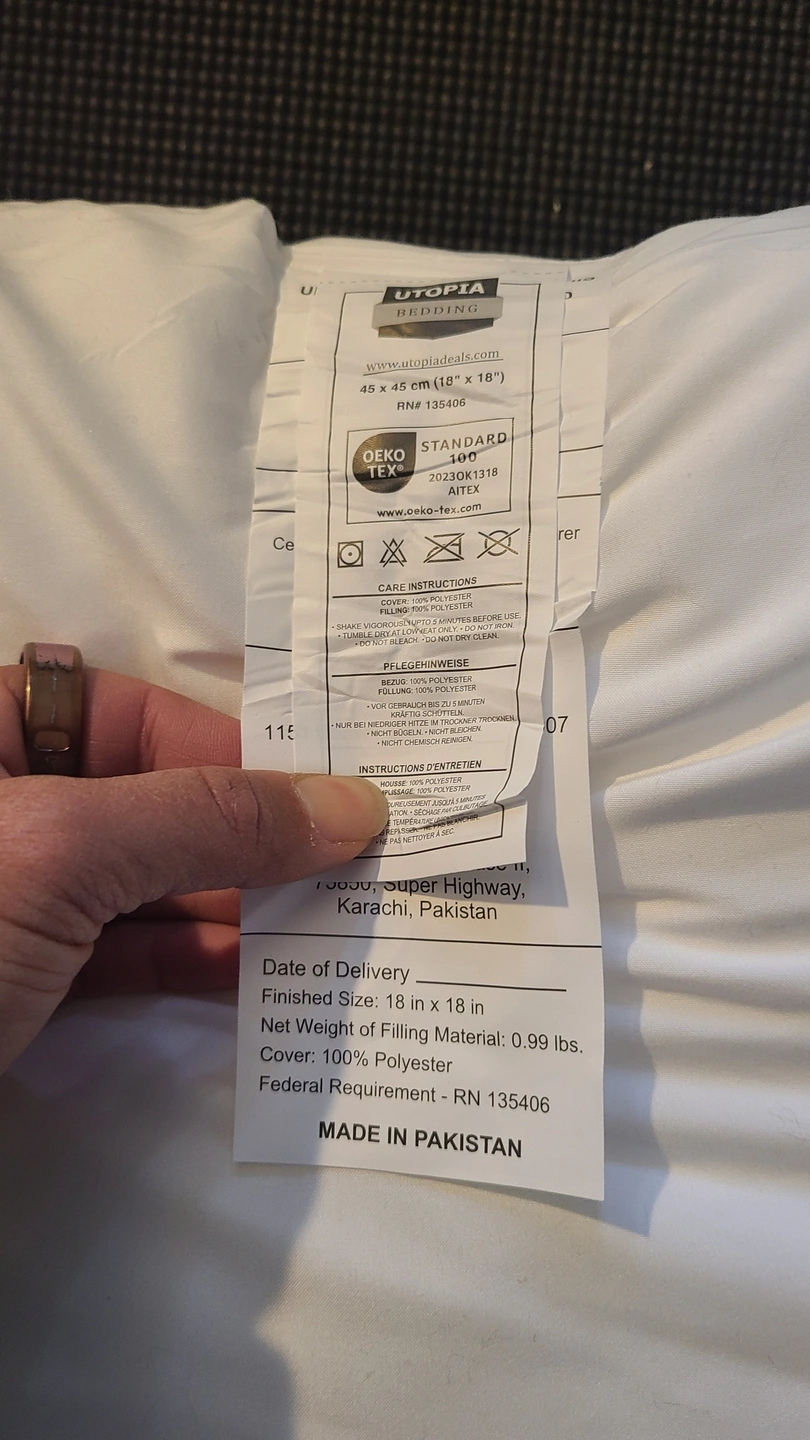 Selling 5x Utopia Bedding pillow, sized at 18 x 18 inches. Brand new. Was just taken out of the vacuum package. The filling is made of 100% polyester, and the cover is also 100% polyester. It's in great condition and ready for a new home!