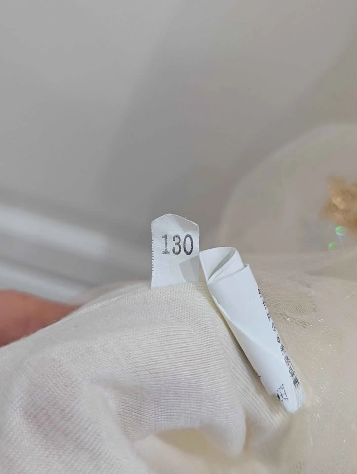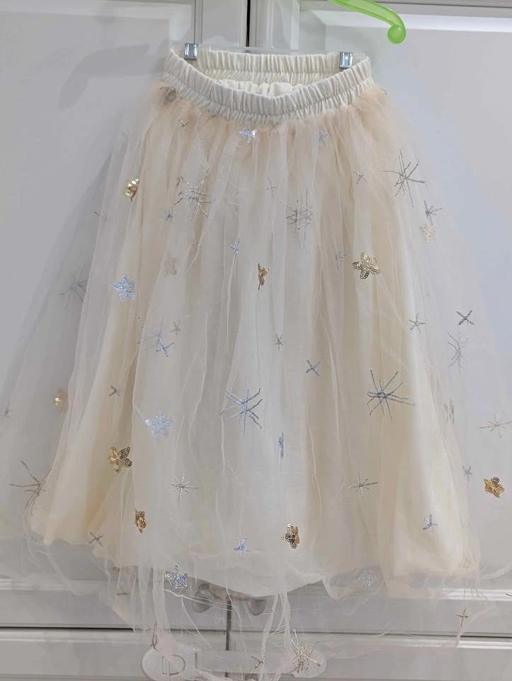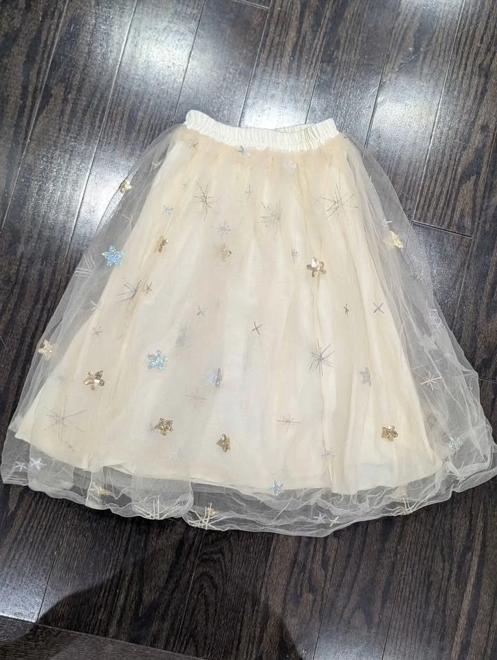 Sparkly long tulle skirt in size approx. US 6–9. Cream color with silver and gold stars and snowflake designs for a magical look. Features an elastic waistband for a comfortable fit. Perfect for parties, holidays, or dress-up.