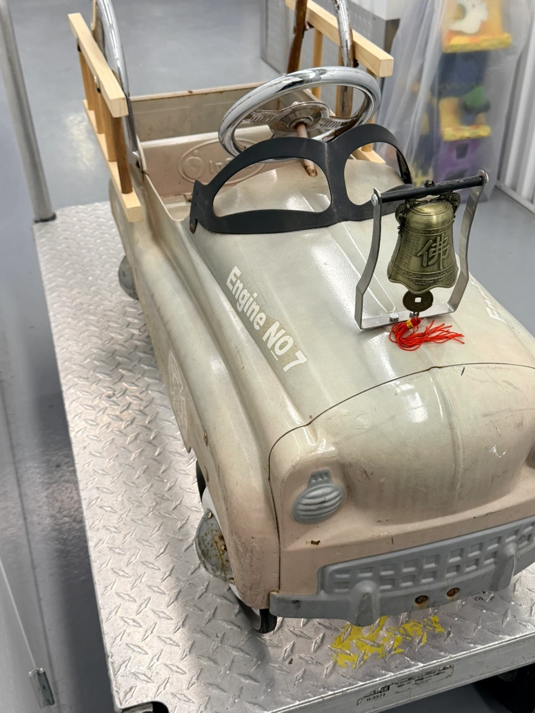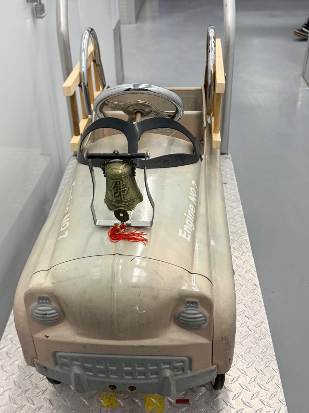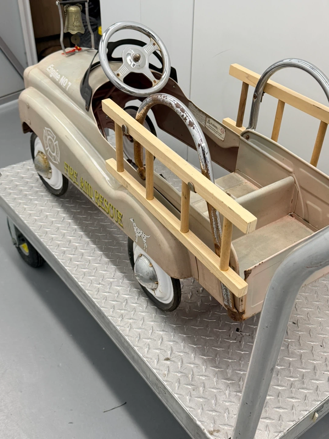 This is a vintage fire engine pedal car, marked 'Engine No. 7' and 'FIRE AND RESCUE'. It features wooden ladders on the sides and a working bell on the front. It has a metal body with some signs of wear, consistent with its age.