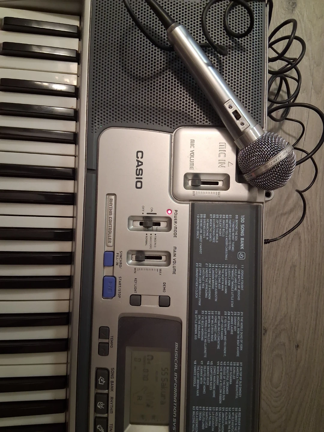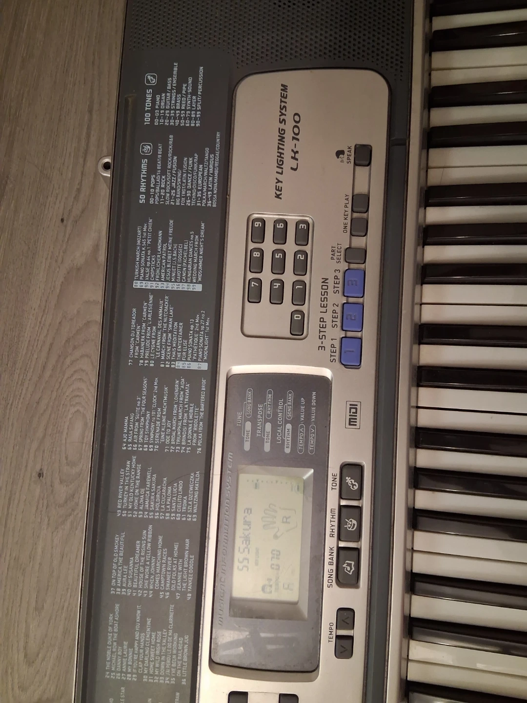 Casio LK-100 keyboard with a 3-step lesson system and key lighting. It comes with a microphone for vocal input. This model features 100 tones and 100 rhythms for musical exploration.