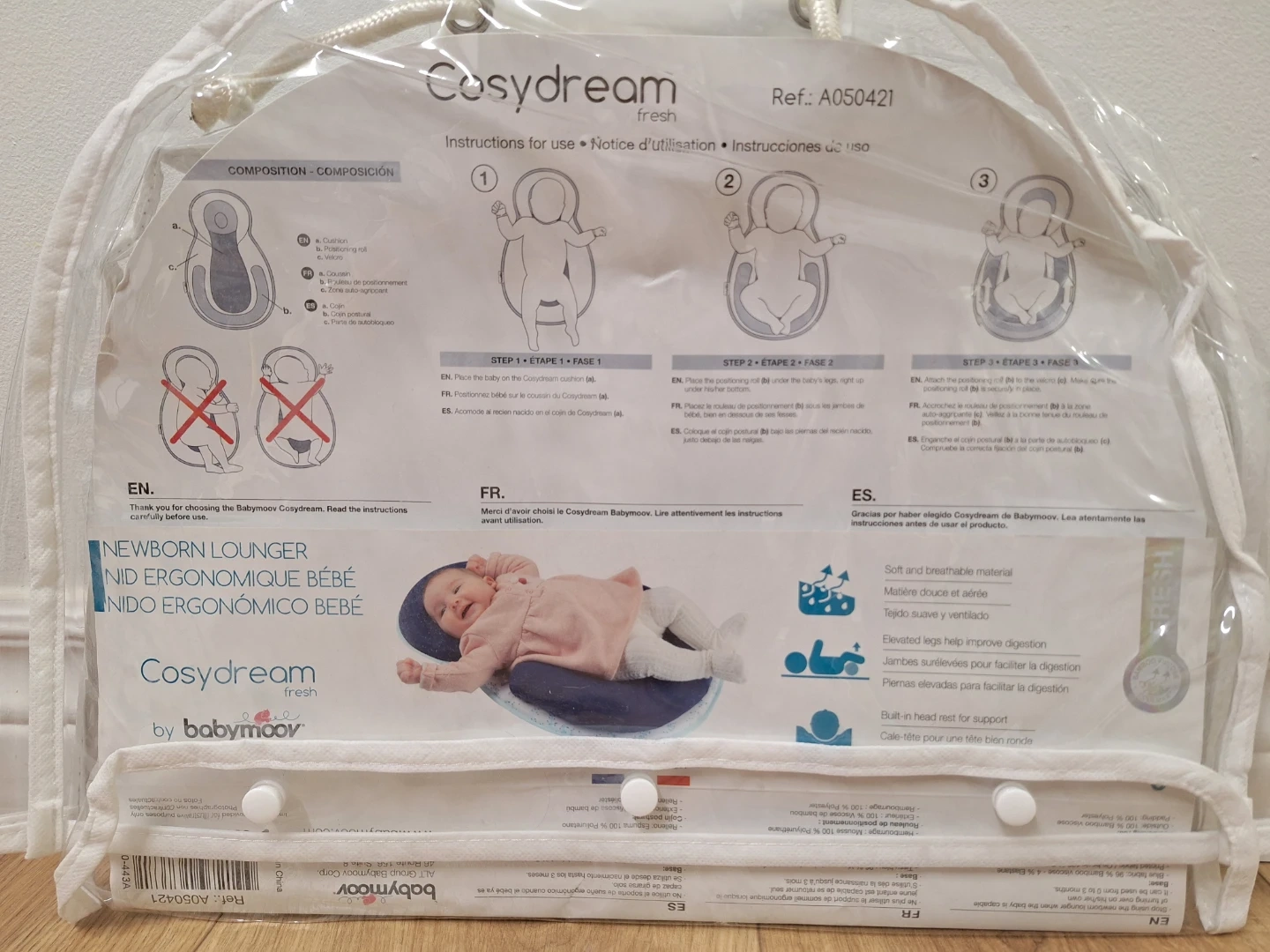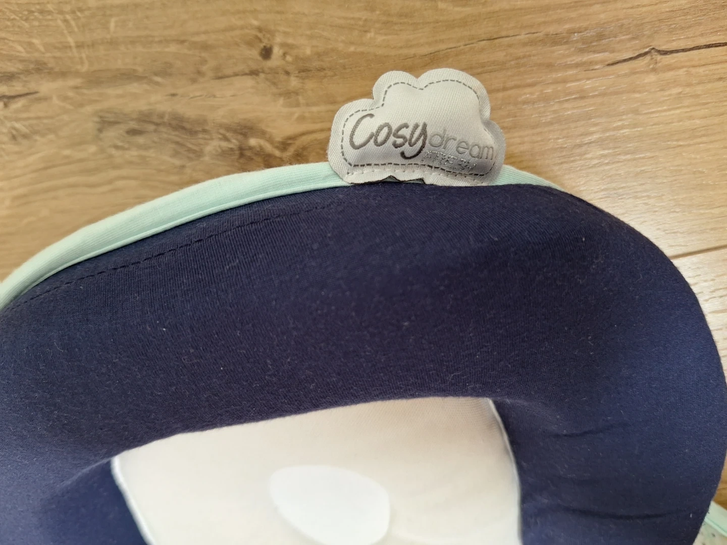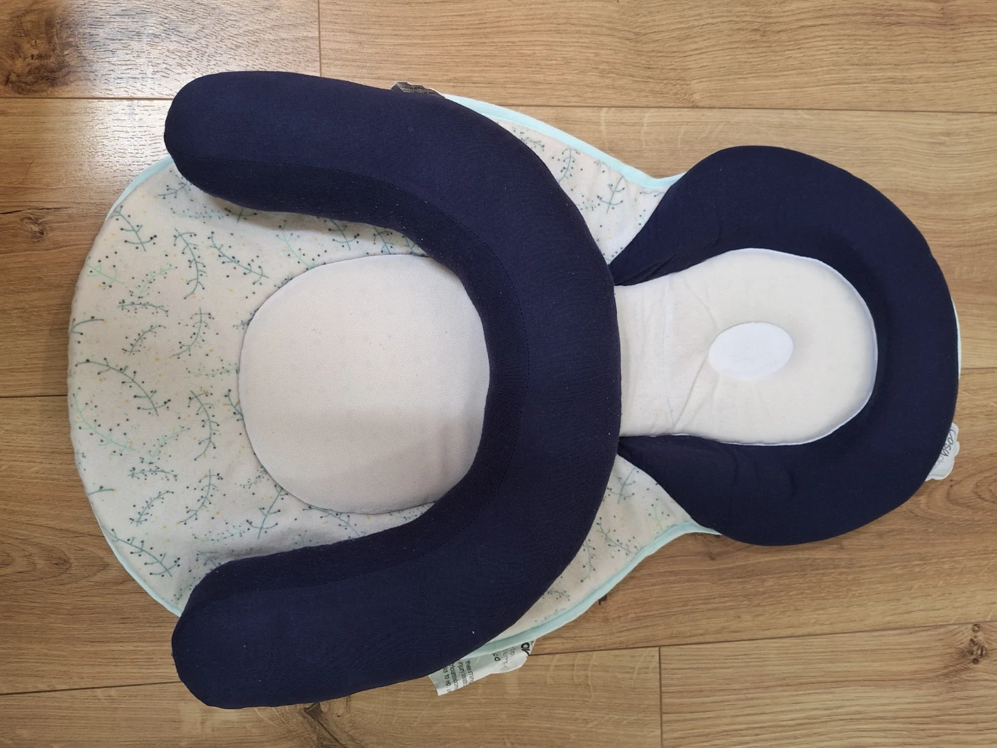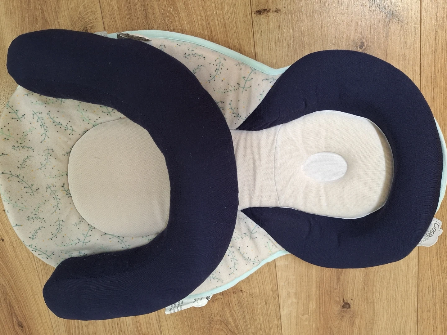 This is a Babymoov Cosydream Fresh newborn lounger. It's made with soft and breathable material and has a built-in head support. The lounger is designed to help with digestion and keep baby's head nicely round.