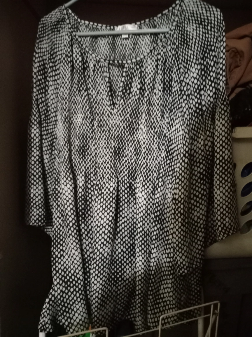 A black and white dot print blouse with a V-neckline and elbow-length sleeves. It's made of a lightweight, flowy fabric. This top's pattern makes it a versatile piece for casual or dressy occasions.
