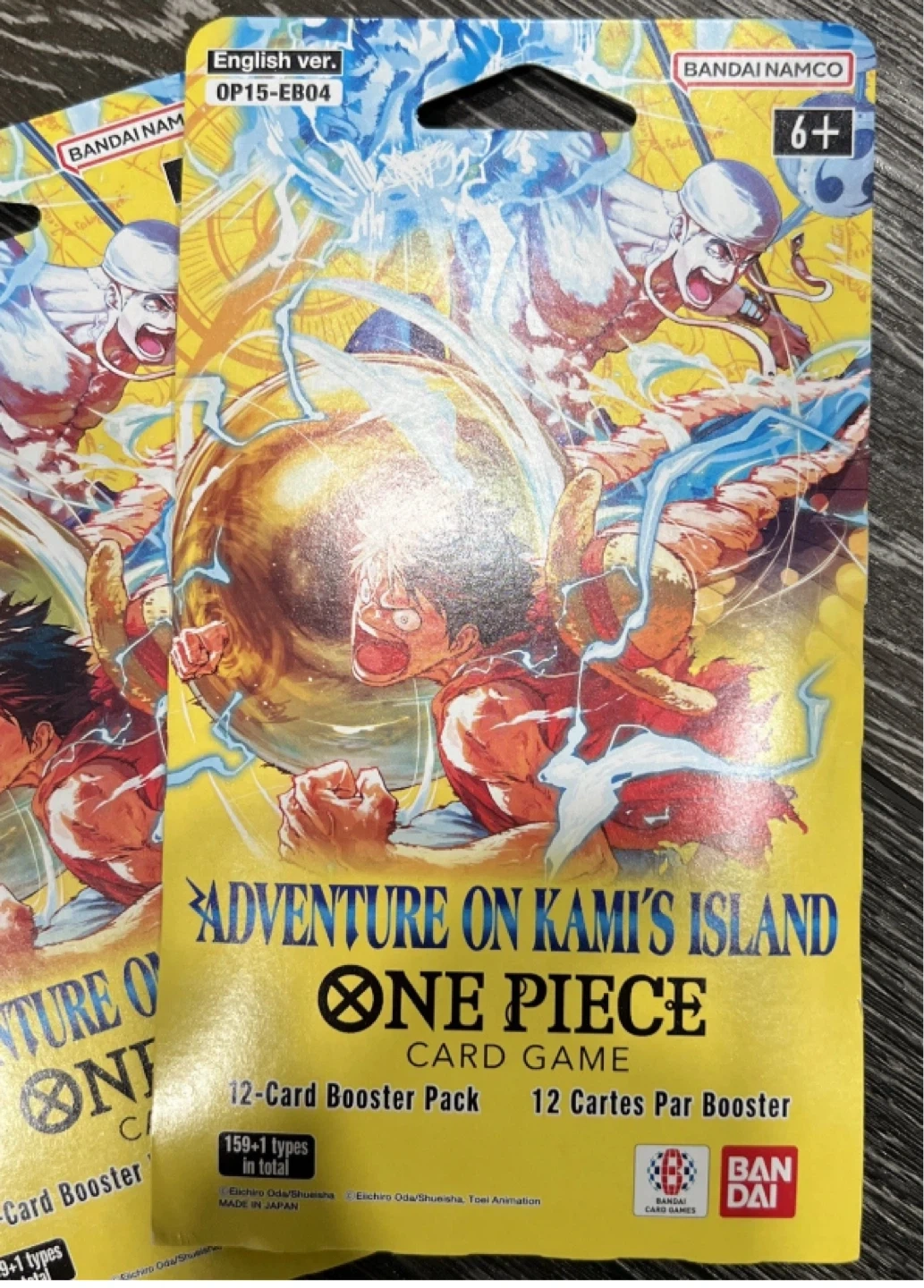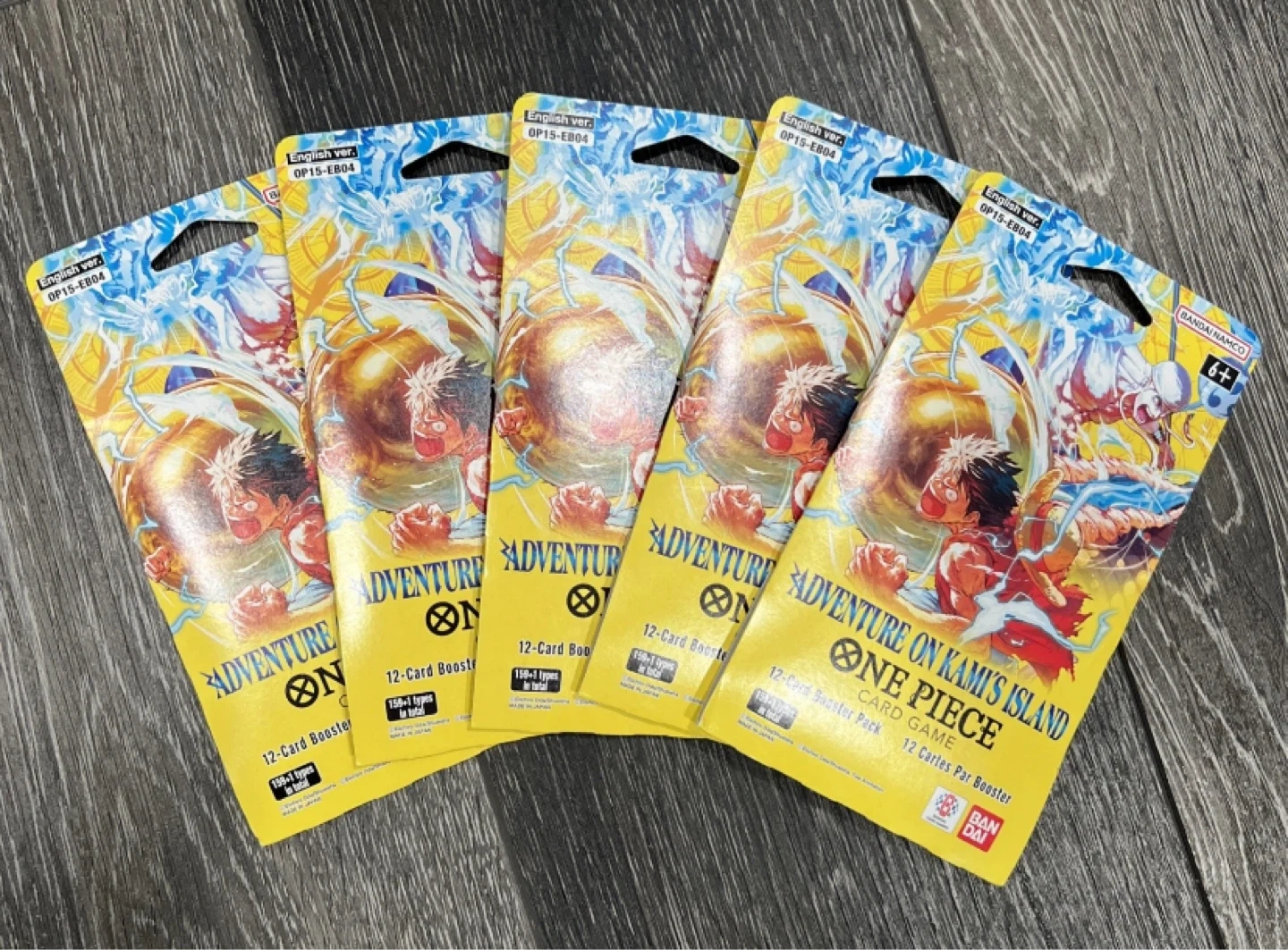 Selling 5 booster packs of the One Piece Card Game, 'Adventure on Kami's Island' set. Each pack contains 12 cards. These are English versions made in Japan. Recommended for ages 6+.